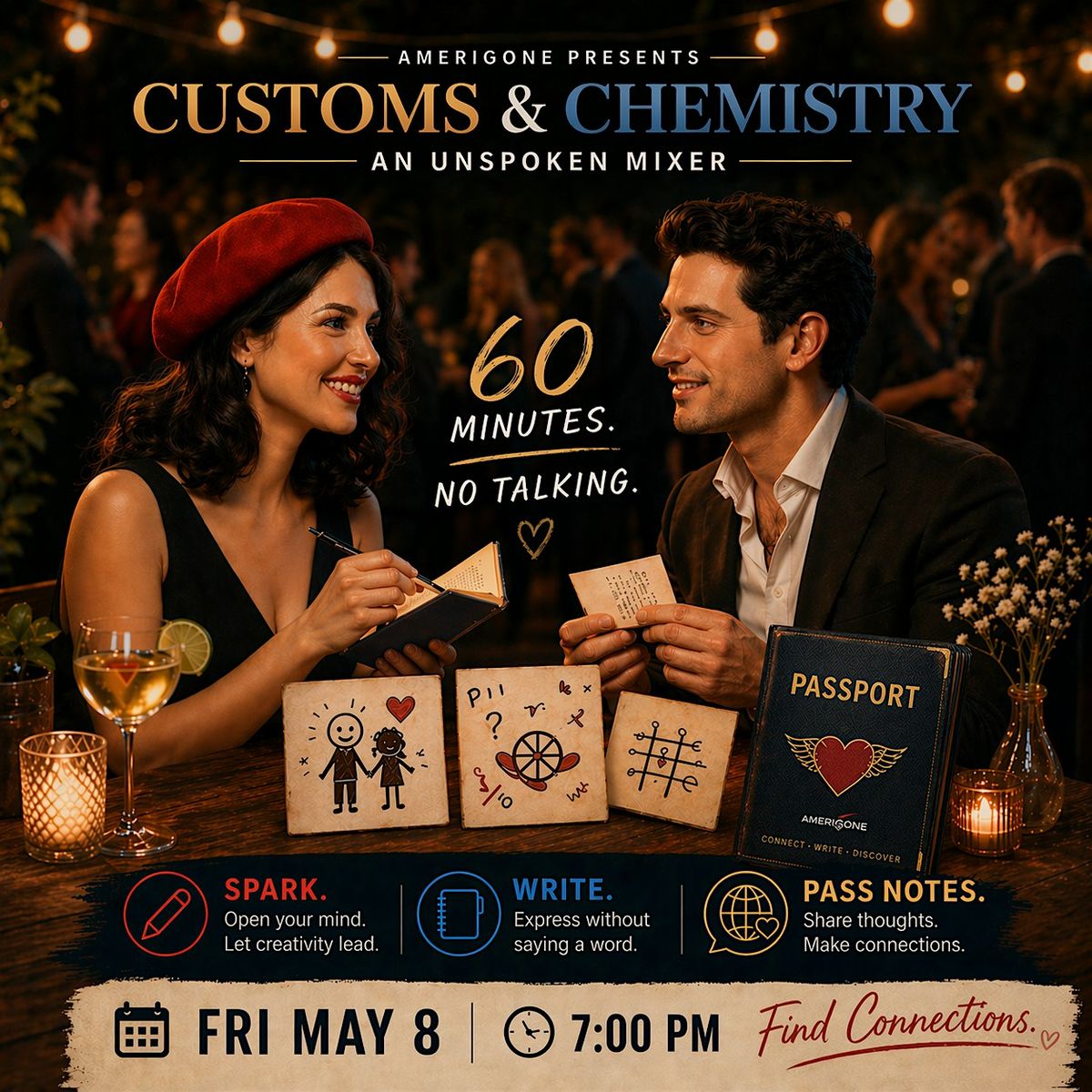Guided by our Chief Customs Officer, you will rotate through a series of rapid-fire, silent matches. Every few minutes, you’ll be given a new "Immigration Prompt." You and your match will swap Passports to collaboratively doodle, answer bizarre questions, and playfully interrogate each other without making a sound.
