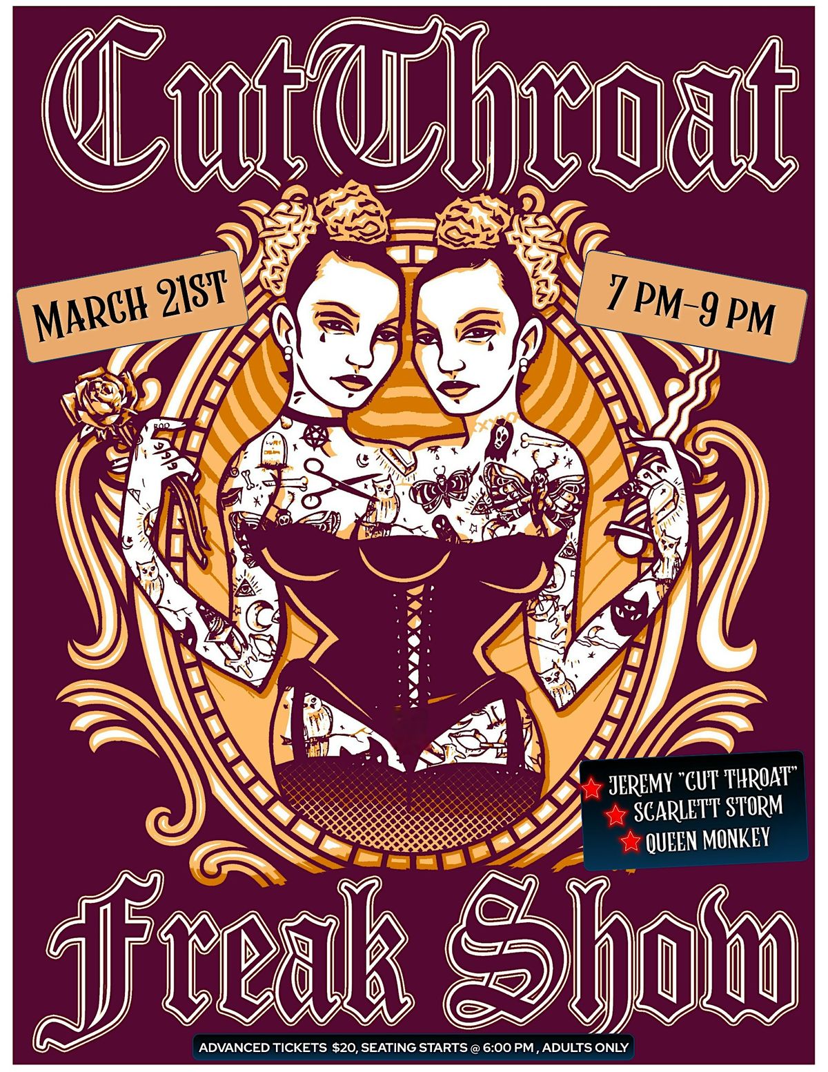 Get ready for a wild night at the Cut Throat Freak Show! This in-person event is packed with jaw-dropping acts and mind-blowing performances that'll leave you buzzing. Forget the ordinary – come see the freaky, the bizarre, and the downright crazy all live. Bring your friends, grab a drink, and dive into the madness! Seating begins at 6 pm. Adults 21+ only