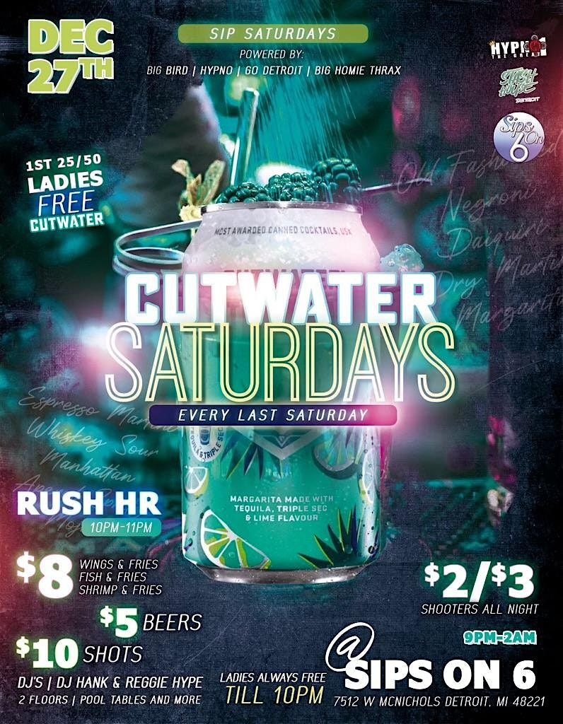 Join us for a chill Saturday vibe at Sips On Six with Cut Water Saturdays – good drinks, great company, and awesome tunes!About this Event