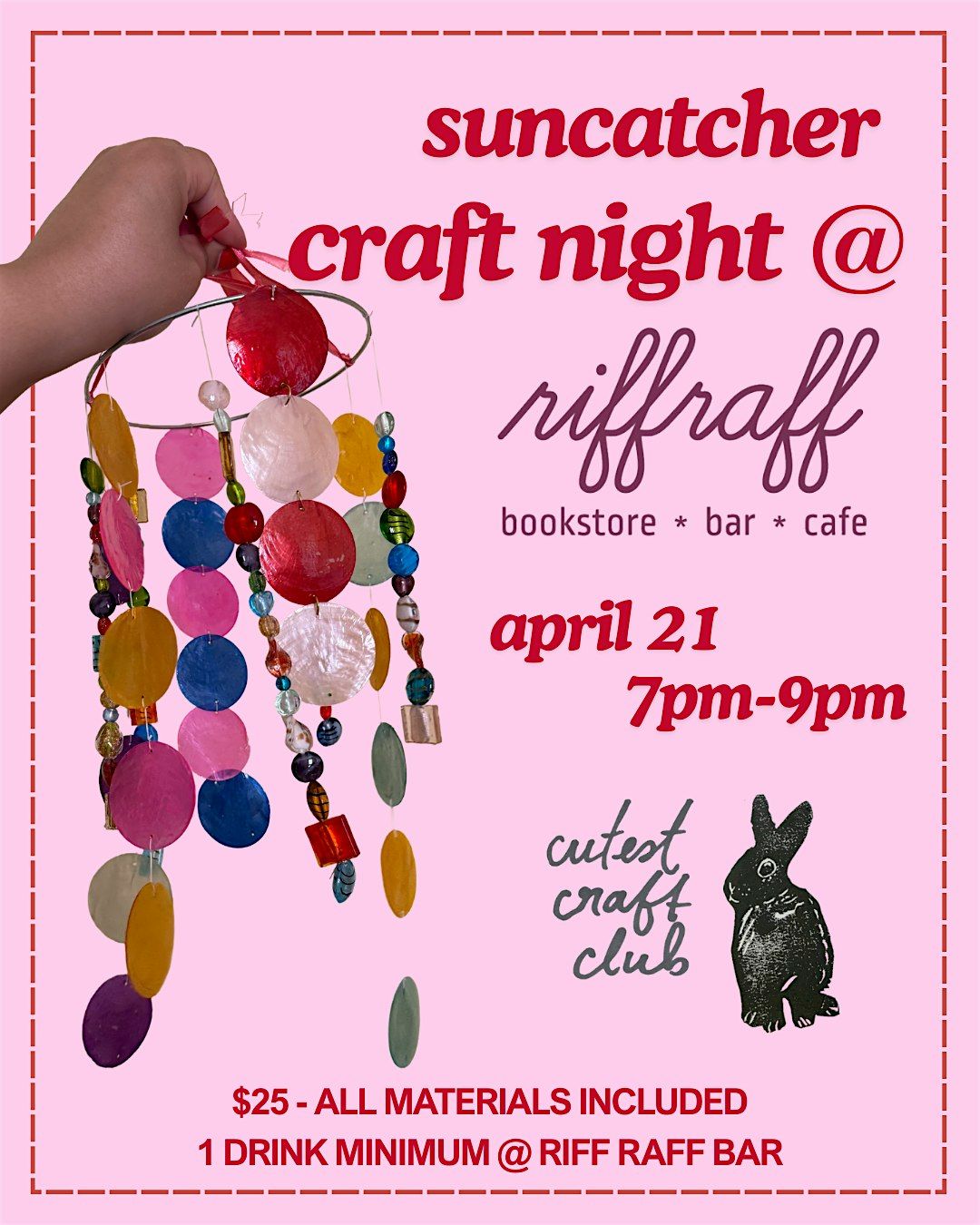 come join us for a fun night of crafting + cocktails!! we'll be making suncatchers - all materials will be provided! capiz shells, o-rings, beading wire, metal hoop with hanger, jewelry pliers, glass beads, and ribbon!