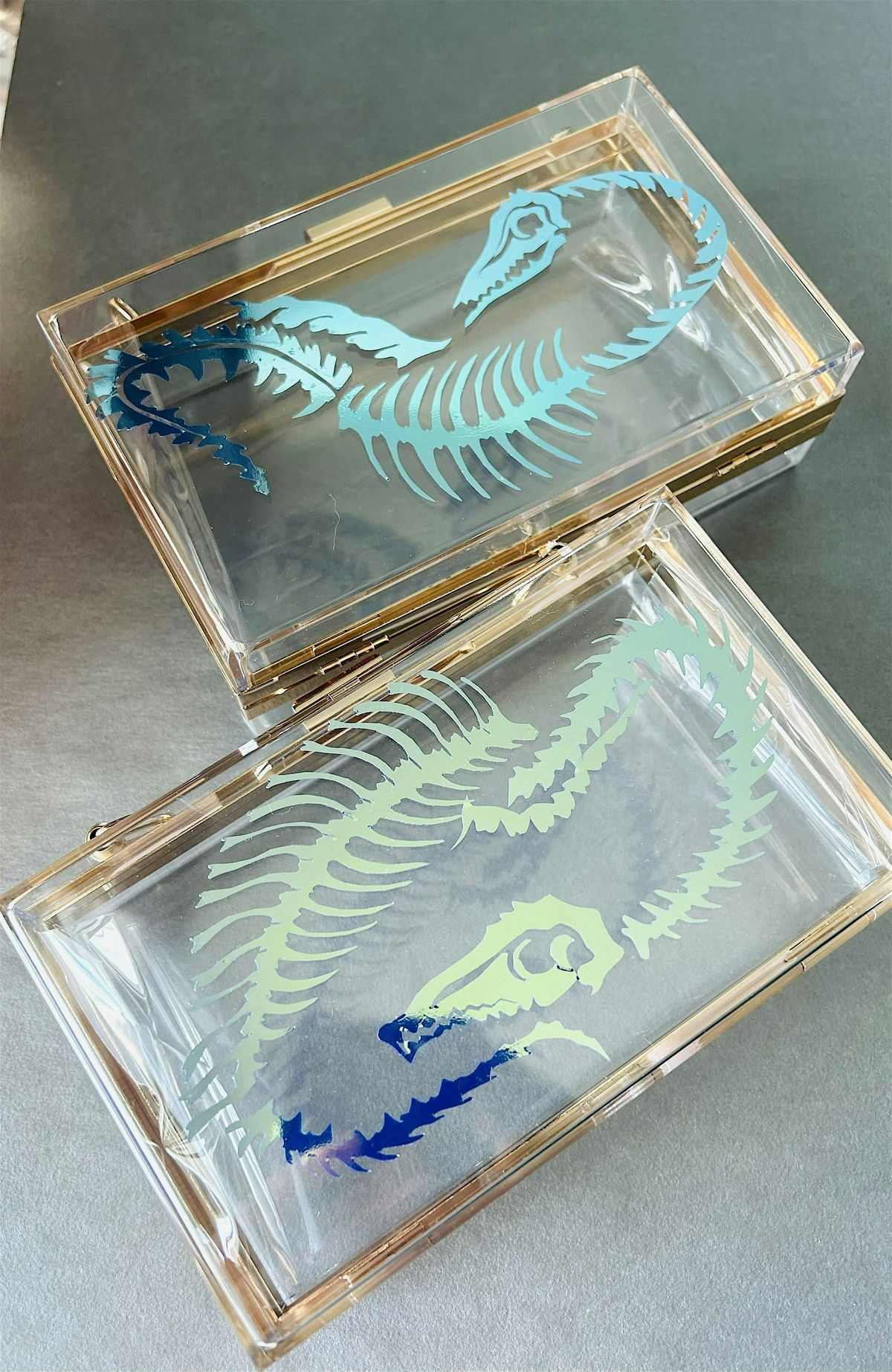 Each participant will finish decorating a mini handbag at the end of the workshop to bring home. The hand bag is pre-made with acrylic in either white, black or transparent color. The decorative materials for cut-out are available in hologram or white color.