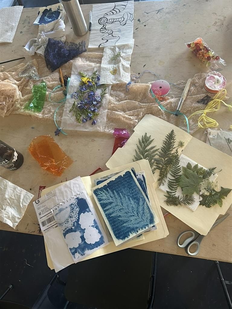 This workshop is a hands-on experience in the entire cyanotype process, from blank paper to finished beautiful blue prints. By using light-sensitive chemicals on paper and fabric, then placing objects like leaves, flowers, lace, jewelry, and more, each student will expose their print to the sun's UV rays in an outdoor space. After washing their print in water, they'll have a unique deep blue print to take home, and each student will leave with 5-10 prints!