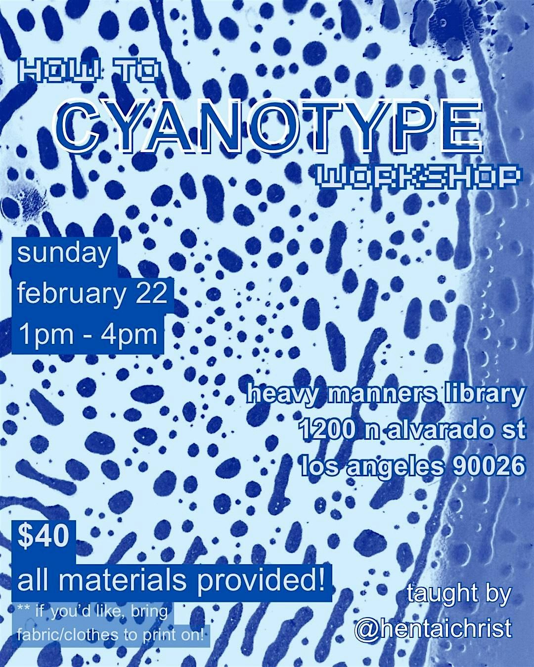 Have you ever wanted to learn how to make cyanotypes?!!!?! We'll be going over cyanotype history, the basics, paper preparation, and experimental methods used in this creative process. All materials will be provided: cyanotype chemistry, paper, transparency film, fabric, textures, and more.