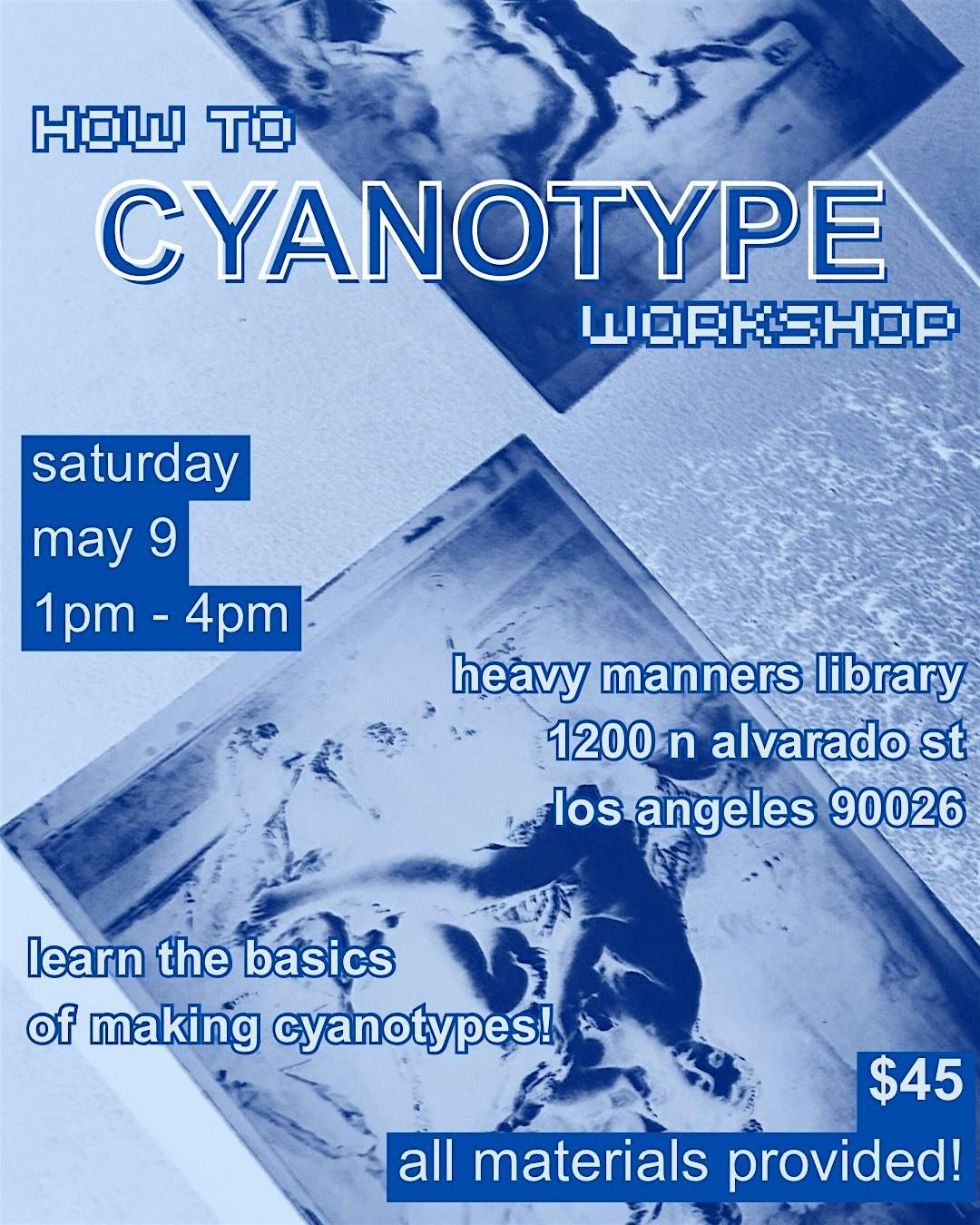 Have you ever wanted to learn how to make cyanotypes?!!!?! We'll be going over cyanotype history, the basics, paper preparation, and experimental methods used in this creative process. All materials will be provided: cyanotype chemistry, paper, transparency film, fabric, textures, and more.