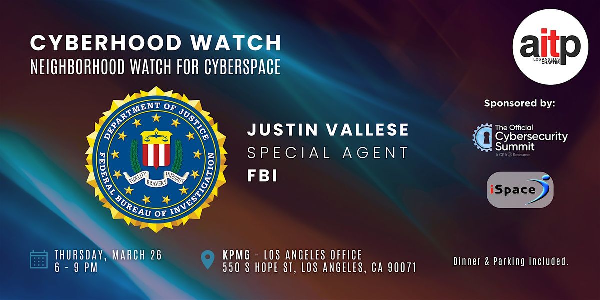 Special Agent Justin Vallese will present an overview of the FBI Los Angeles CyberHood Watch (CHW) program, a community-driven program that connects the FBI with IT partners to share intelligence and combat cyber threats.