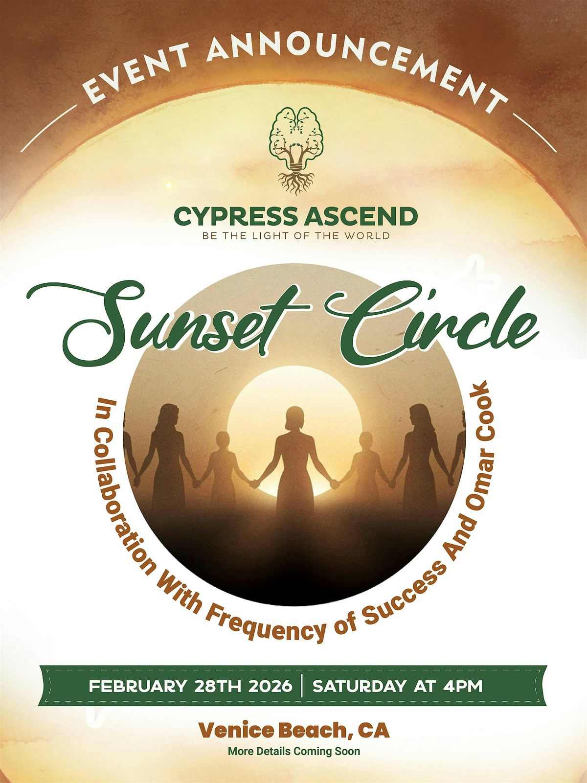 Get ready for a truly special evening with The Sunset Circle, presented by Cypress Ascend in collaboration with Frequency of Success. Join us for an uplifting in-person gathering of meditation, community, and connection as we honor the Universal One - God, Source, or whatever name you call the Creative Power that brings all things into being.
