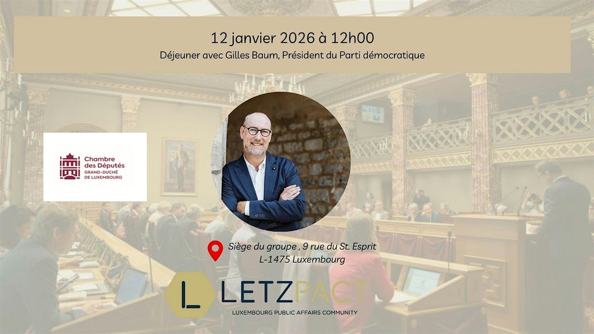 Pour bien commencer l'année 2026, LETZPACT a le plaisir de vous inviter à un déjeuner privé en compagnie de Gilles Baum, Pérsident de fraction du parti démocratique le lundi 12 janvier à 12h00 dans les locaux du parti, 9 rue du St. Esprit L-1475 Luxembourg . Ce déjeuner sera l'occasion d'évoquer l'évolution de la Chambre des députés depuis la perspective du Parti démocratique et les défis à venir.