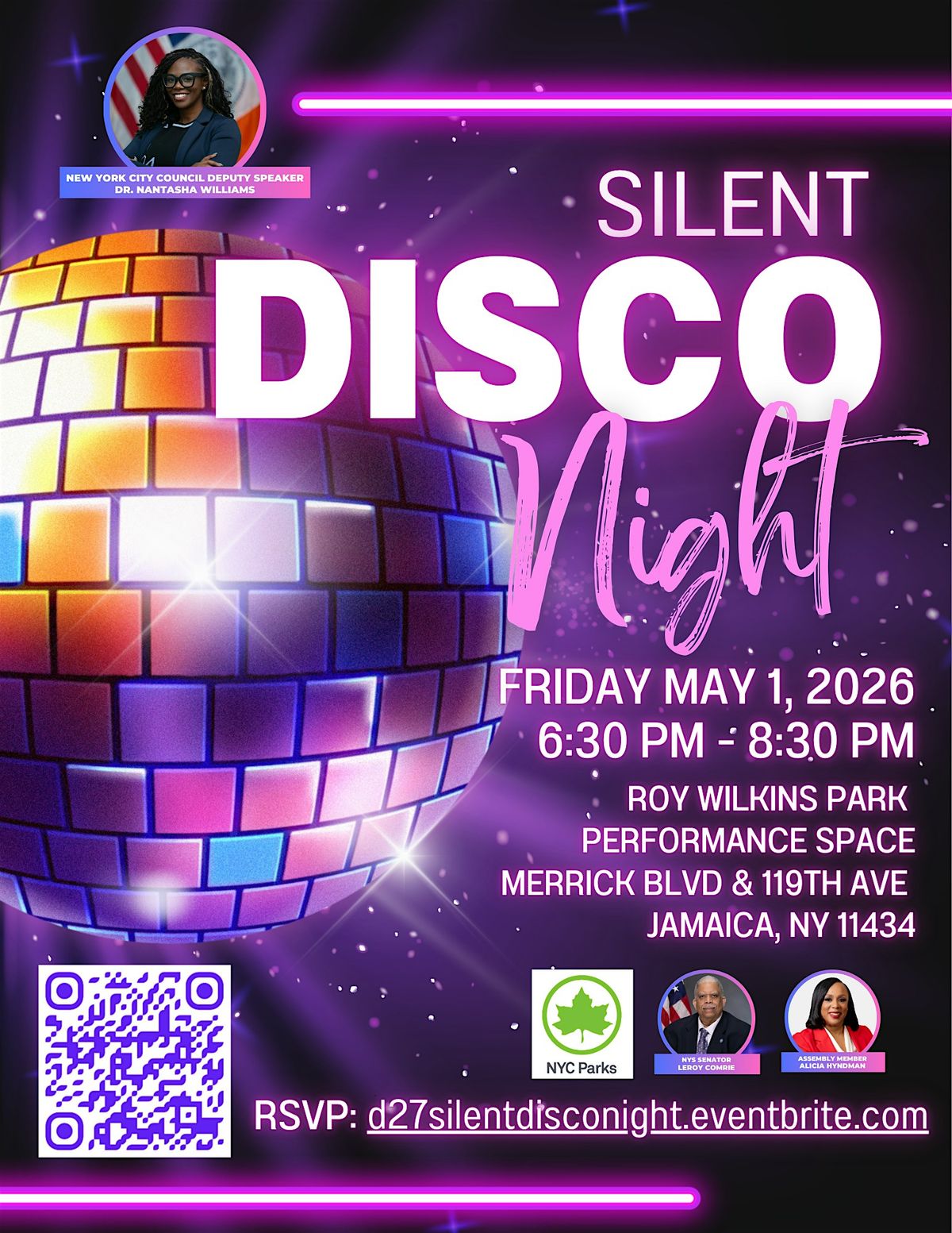 Come join us for a free silent disco party! Join Deputy Speaker Nantasha Williams, NYC Parks, Senator Leroy Comrie, and Assemblymember Alicia Hyndman, for an unforgettable Silent Disco Night at the Roy Wilkins Performance Space in Jamaica, Queens!