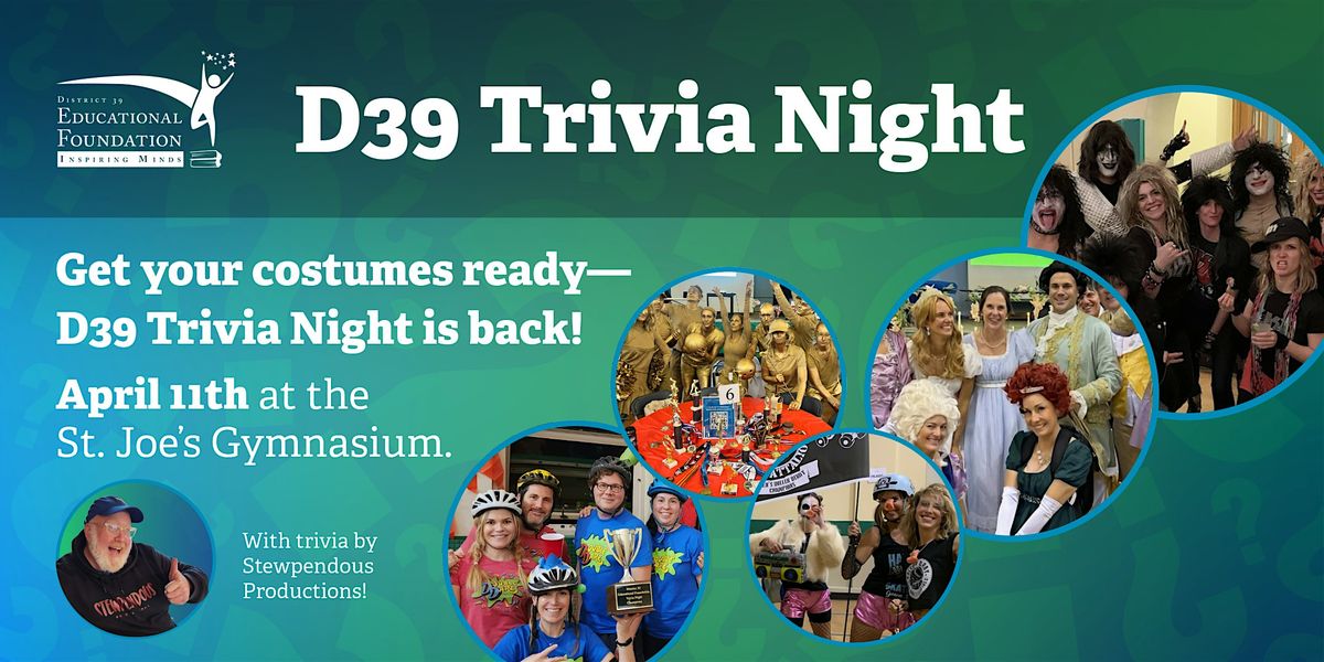 Grab your friends (and your costumes!) and join us for our annual District 39 Educational Foundation Trivia Night on April 11th at the St. Joe’s Gymnasium. Doors open at 6 pm and trivia begins at 7.