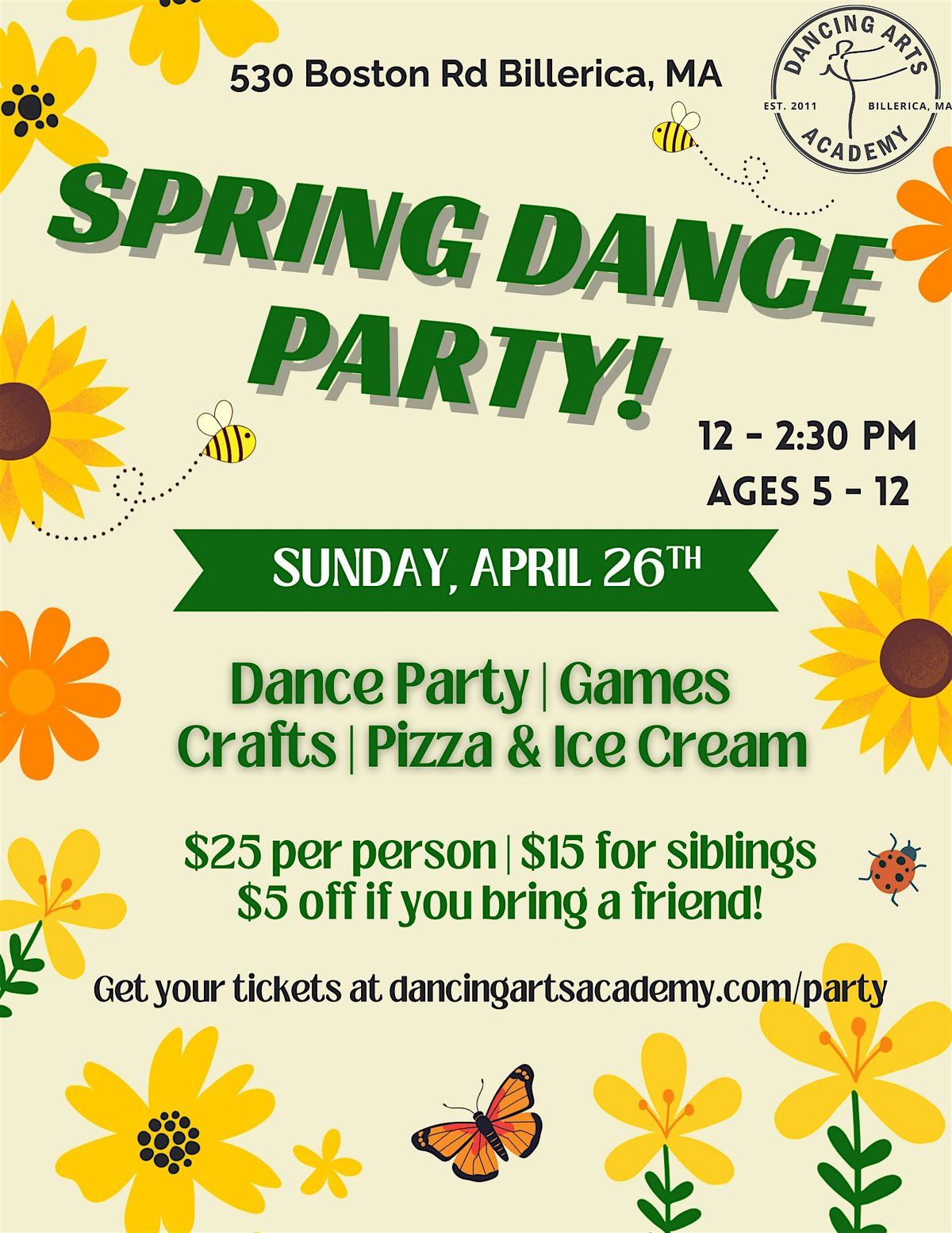 Join us for our Spring Dance Party for kids ages 5-12! There will be a Dance Party, Games, Crafts, Pizza & Ice Cream!