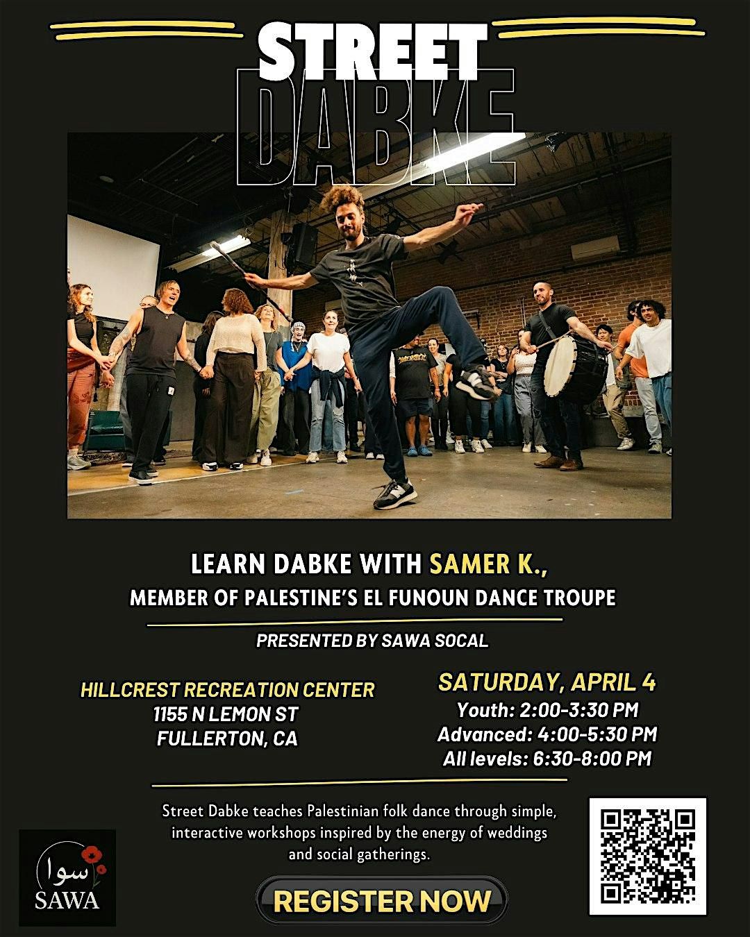 Join us for a special day of Street Dabke workshops with Samer, blending traditional Palestinian dabke with modern rhythm and movement.