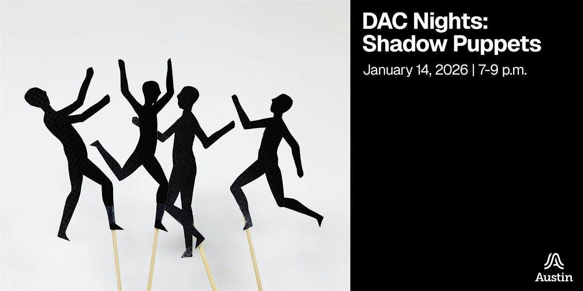 Experience the magic of simple creativity and storytelling at DAC Nights: Shadow Puppets! Participants will build shadow puppets using a variety of materials, crafting characters of all shapes and sizes to tell fantastical tales or create whimsical decorations. Guided by DAC Nights Staff, explore the performance of shadow puppets against a glowing backdrop on the DAC Theater stage. You’ll walk out at the end of event with puppets and a simple walkthrough for setting up puppet shows to take the adventures of your newfound friends home with you.