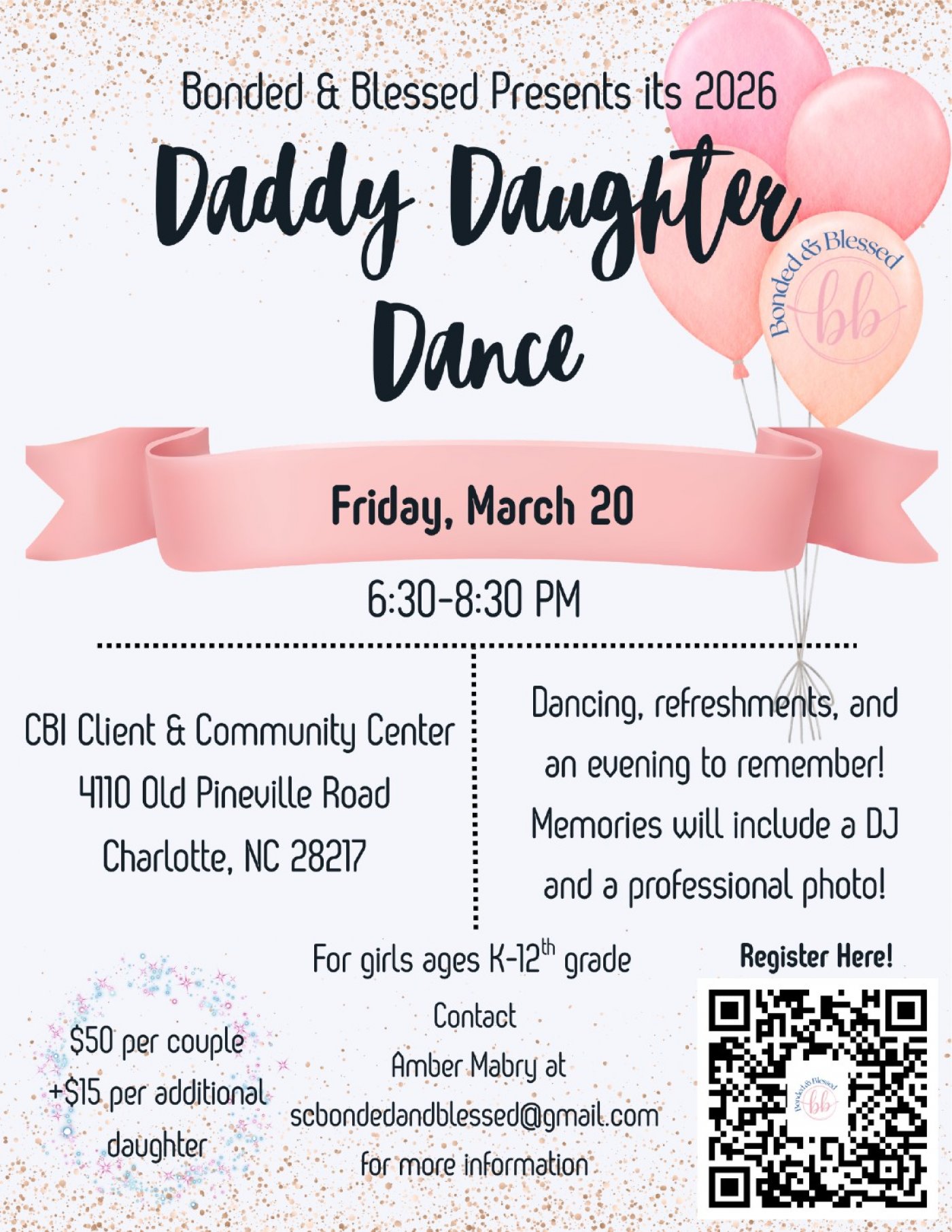Register to attend the Daddy Daughter Dance 2026. An evening to remember for dads and daughter ages K-12th grade. Cost of the dance is $50 per couple, each additional daughter is $15. Cost includes DJ, professional photographer, light refreshments, and a take home item. Payment is due within 24 hours of registration submission to hold your spot. Please contact Amber Mabry at [email protected] with any questions.