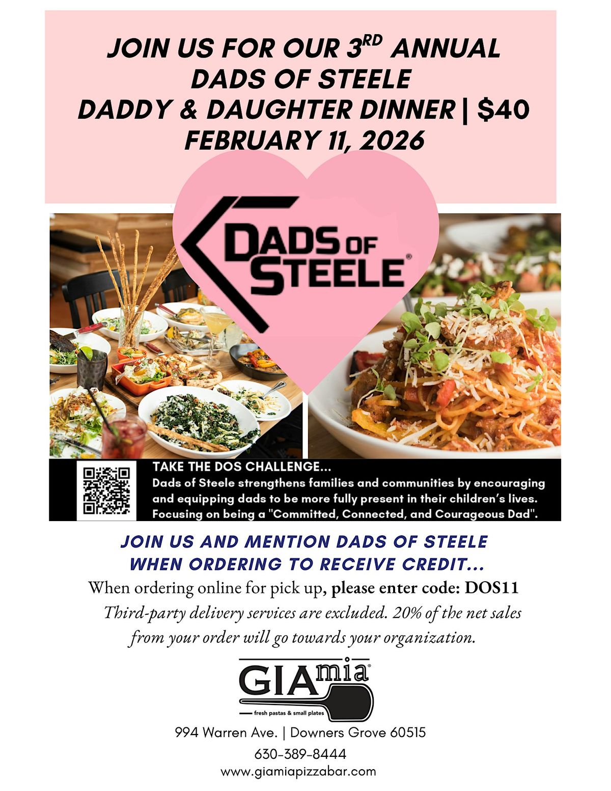 Join us for the 3rd Annual Dads of Steele Daddy & Daughter Dinner on February 11, 2026, at Gia Mia Pizza Bar in Downers Grove. For $40, enjoy a special prefixed menu while dads and daughters share an unforgettable evening centered on quality time, meaningful connection, and lasting memories. This event supports the mission of Dads of Steele, strengthening families by encouraging fathers to be present, committed, and courageous leaders in their homes and communities. Reservations are limited—come celebrate love, leadership, and family together. Call for reservations at 630-389-8444.
