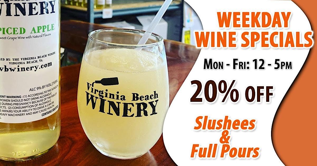 Stop by the Virginia Beach Winery for our $5 wine tasting during the week from 12 ( noon ) to 5pm 7 days a week!