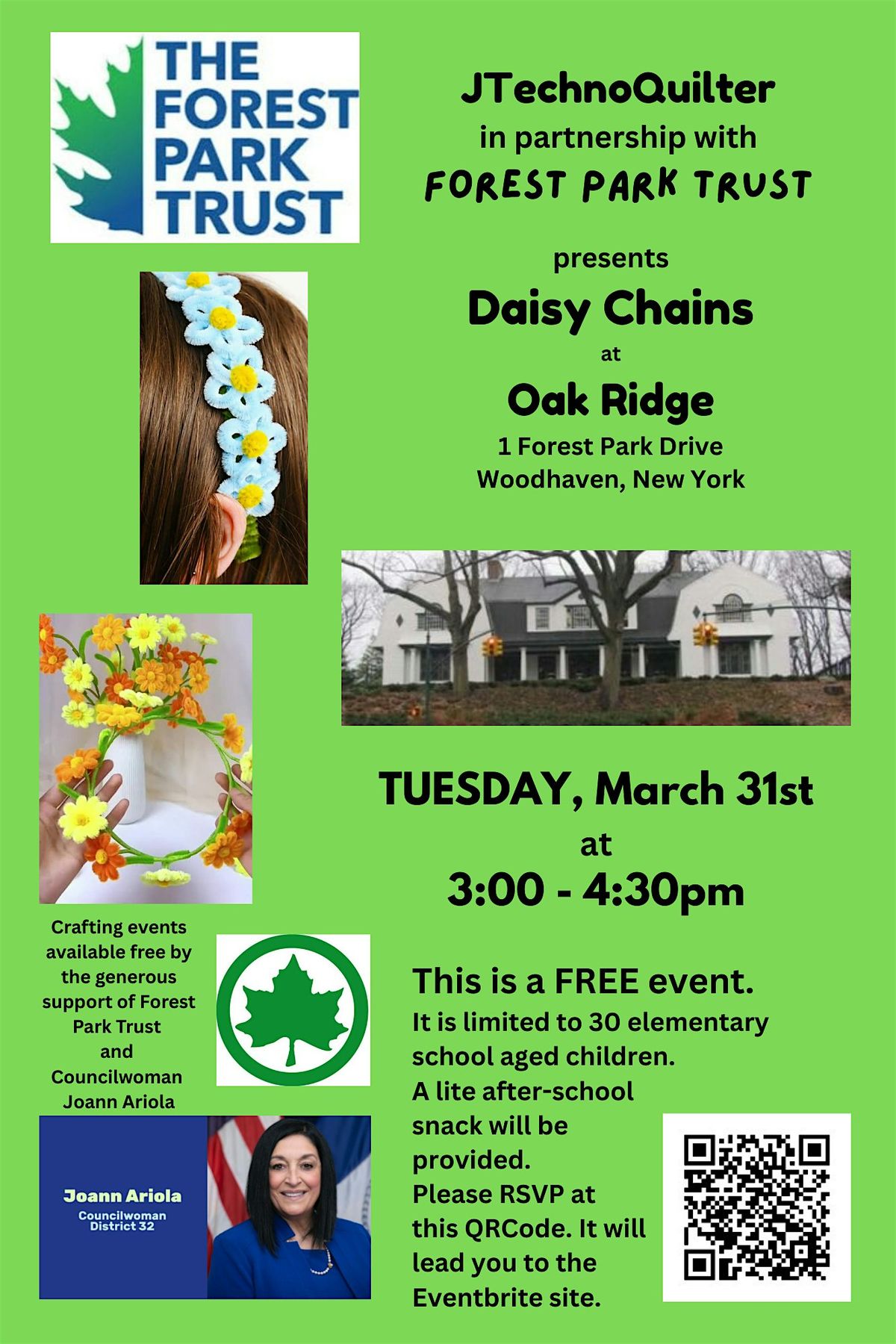 Enjoy an afternoon with your young crafter in the beautiful, historical NYC Parks building, Oak Ridge, endearingly nicknamed by my young crafters, "the white house on the hill." Thank you to The Forest Park Trust and Councilwoman Joann Ariola. Join us in this FREE engaging, crafting, community uniting opportunity to be together.