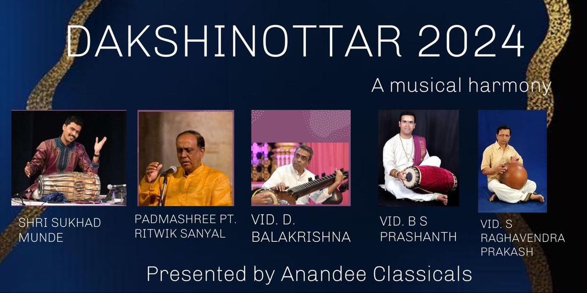 We are presenting Dakshinottar, a musical harmony of Dhrupad and Carnatic style of music. This program will have two halves. First half, would be Dhrupad vocal by Padmasree Pandit Ritwik Sanyal ji from Varanasi. He is the senior most Dhrupad artist representing Dagar Gharana in India. He will be accompanied by Pakhawaj Maestro Shri Sukhad Mundeji. In the second half we will experience grand veena concert by Sangeeta Kalaratna Vid D Balakrishna ji who will be accompanied by Vid B S Prashanth in Mridanga and Vid S Raghavendra Prakash in Ghata. Please come and join to celebrate and experience this wonderful musical journey.