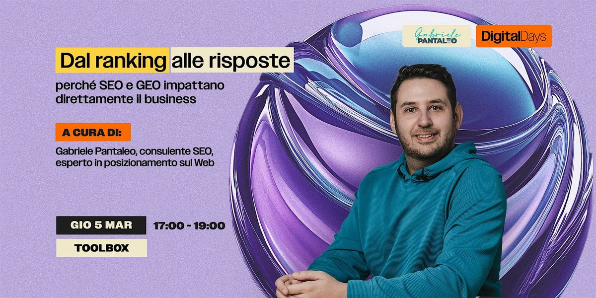 Ne parleremo giovedì 5 marzo presso Toolbox, dalle 17:00 alle 19:00, insieme a Gabriele Pantaleo, Consulente SEO ed Esperto in Posizionamento sul Web, con un talk che si concentrerà su: