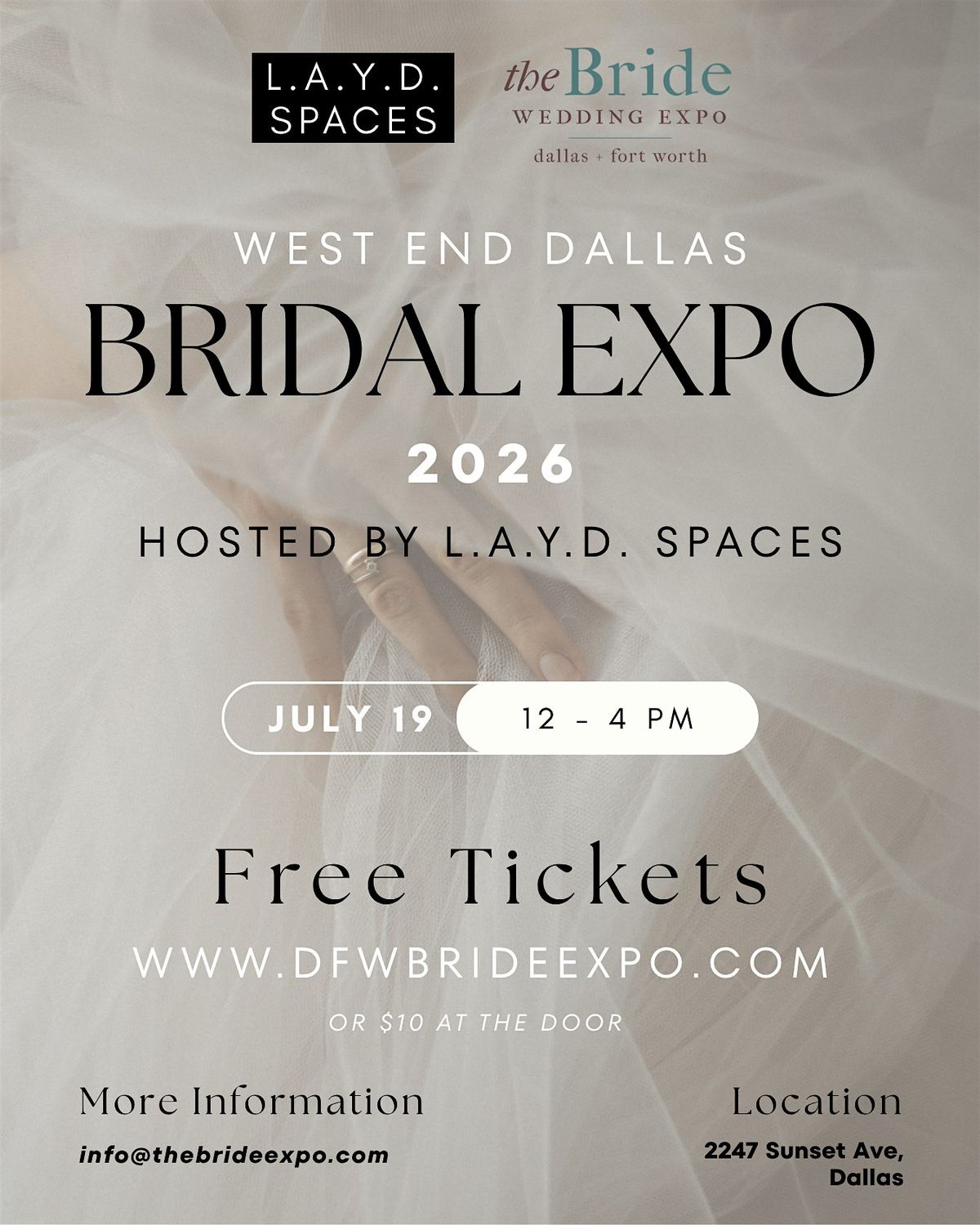You're engaged — now what? Come spend the morning surrounded by everything you need to make your big day unforgettable at The Bride Expo: Dallas, happening July 19th at the stunning L.A.Y.D. Spaces event center in the West End District.