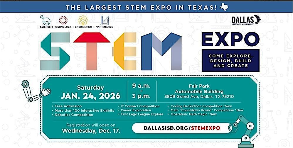 The STEM (Science, Technology, Engineering, Mathematics) EXPO is open to ALL Dallas area families! Come experience over 140 hands-on STEM exhibits and the Dallas ISD STEM championships in mathematics, science, robotics, technology, and coding.