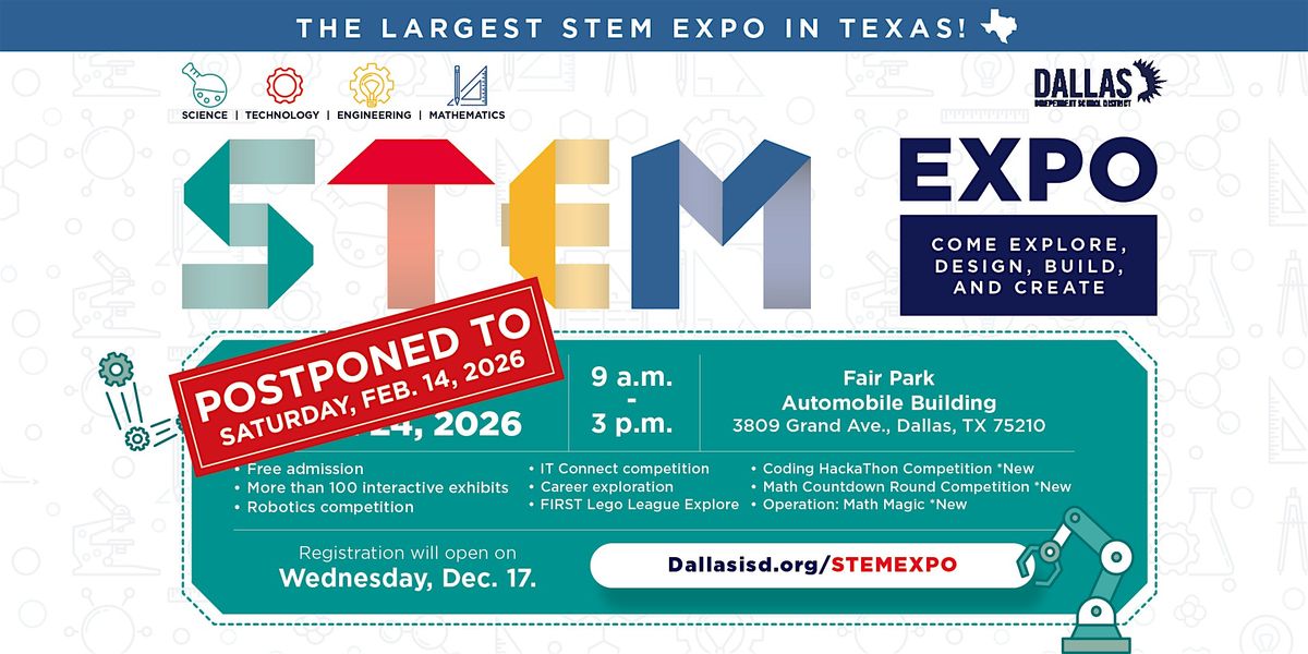 The STEM (Science, Technology, Engineering, Mathematics) EXPO is open to ALL Dallas area families! Come experience over 140 hands-on STEM exhibits and the Dallas ISD STEM championships in mathematics, science, robotics, technology, and coding.