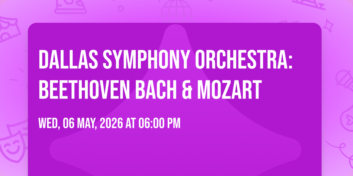 🎉 Welcome to Dallas Symphony Orchestra: Beethoven Bach & Mozart, where the impossible becomes possible and dreams take flight! 🏛️ Join us at Meyerson Symphony Center in the heart of Dallas, TX for an event that will redefine your expectations. 📅 On May 8th, 2026 at 06:00 PM, witness the transformation of space and time into something truly magical. ✨ It's a curated experience combining the best of innovation, entertainment, and community spirit, creating moments that will be remembered for years to come. Whether you're a first-time visitor or a seasoned enthusiast, prepare to be amazed. 🎊 Book now to ensure your place in this unforgettable experience!http://maps.seatics.com/MeyersonSymphonyCenter_EndStage2_2025-08-08_2025-08-08_1135_08082025_114901_SVGC_tn.png