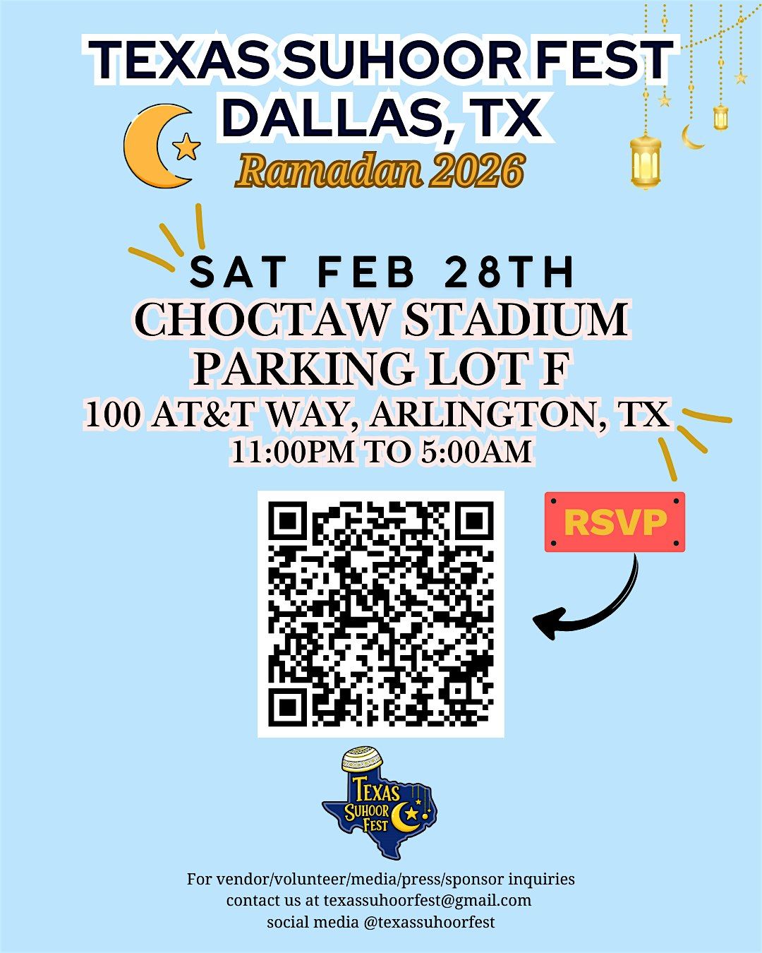 DALLAS, we're back!! The FOURTH annual Texas Suhoor Fest is here and better than ever! We're excited to bring y'all another memorable experience, the LARGEST suhoor fest in the state! Experience the unparalleled charm of the Texas Suhoor Fest, a unique suhoor festival that brings together the finest halal cuisine from across the state of Texas. Immerse yourself in an enchanting night market filled with vibrant energy, where you can create lasting memories surrounded by fantastic vibes. Join us for a celebration of exceptional flavors and a one-of-a-kind suhoor experience!