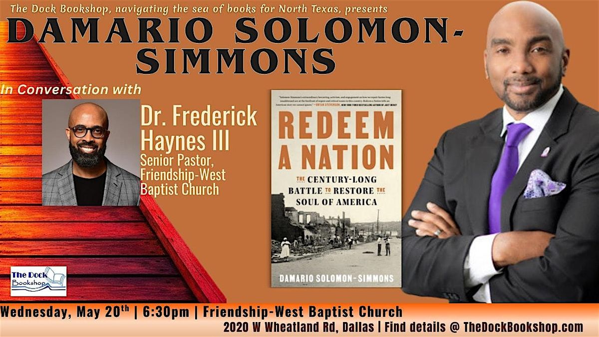 The Dock Bookshop is the bookseller for this special event which will feature a dynamic conversation between Solomon-Simmons and Dr. Frederick D. Haynes III, Senior Pastor of Friendship-West Baptist Church. Together they will explore the century-long struggle for justice, civil rights, and the ongoing fight to restore the moral soul of America.