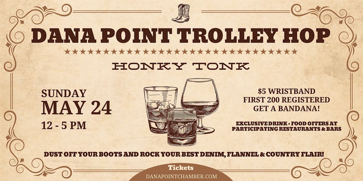 Saddle up! The Dana Point Trolley Hop is happening Sunday, May 24, 2026 from 12:00-5:00pm with a Country theme! Purchase a $5 trolley hop wristband for access to exclusive drink specials at participating restaurants and bars in Dana Point.