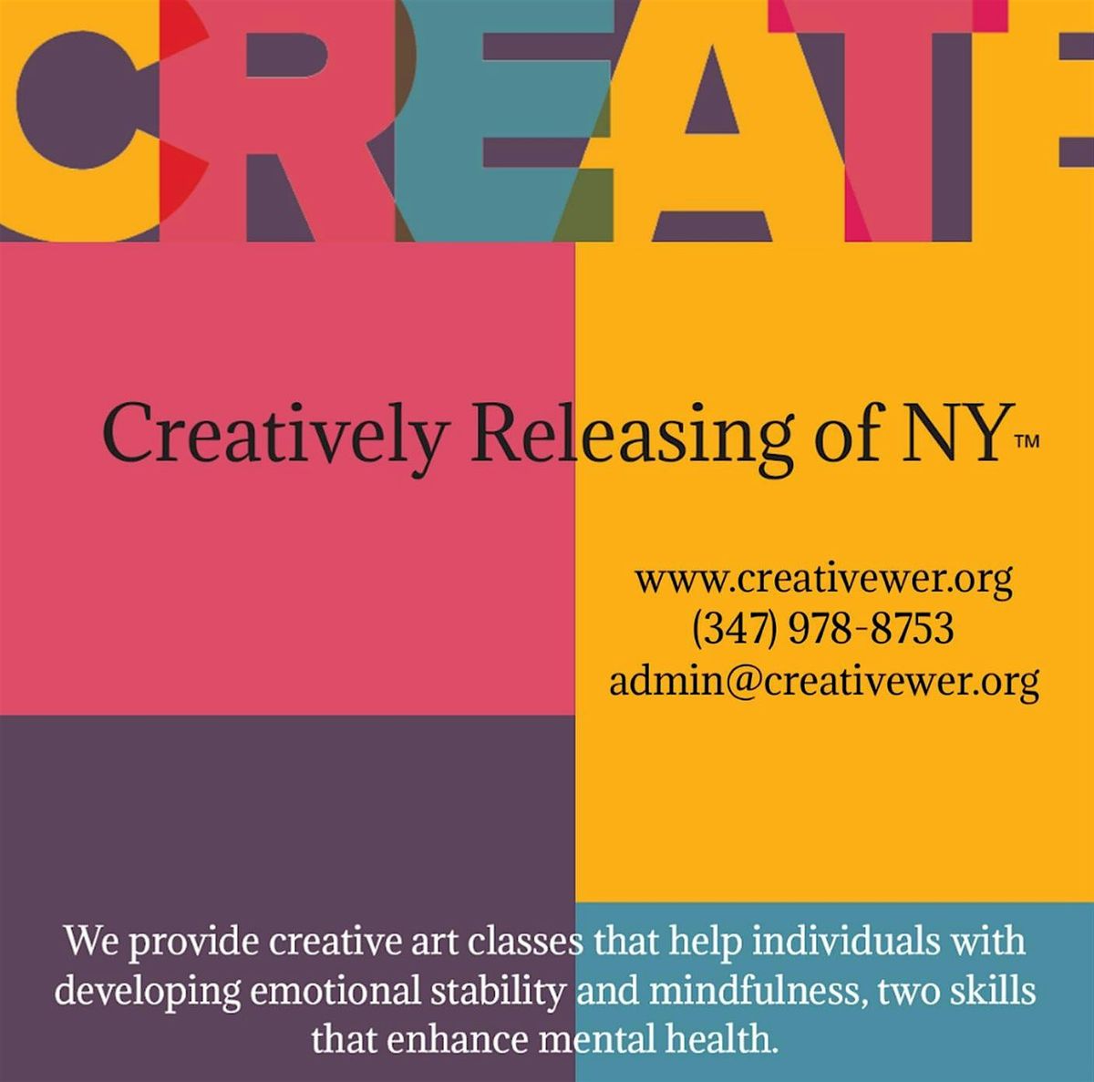 Creatively Releasing of NY LLCâ„¢, an MBE and MWBE-certified small business located in Brooklyn, New York, dedicated to promoting mental wellness and self-discovery for both children and adults through artistic expression. They provide community members with the most effective strategies for cultivating mindfulness, emotional stability, and mental health wellness.