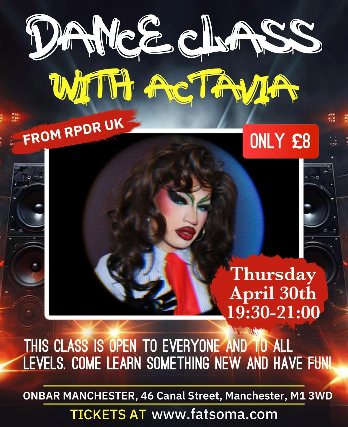 Actavia’s Dance Workshop:Come and join me (Actavia from Rupaul’s Drag Race UK) for a dance workshop that is open for all queer people (and ally’s) and queer performers. This dance workshop will be an open supportive space to learn something new, meet and socialise with others, and of course of loads of fun!Whether you’ve never danced before, dance for fun in your bedroom or are a trained performer, this workshop is open to anyone and everyone. I’m so excited to share my first love of dancing with you and I really hope to see you there😊💃