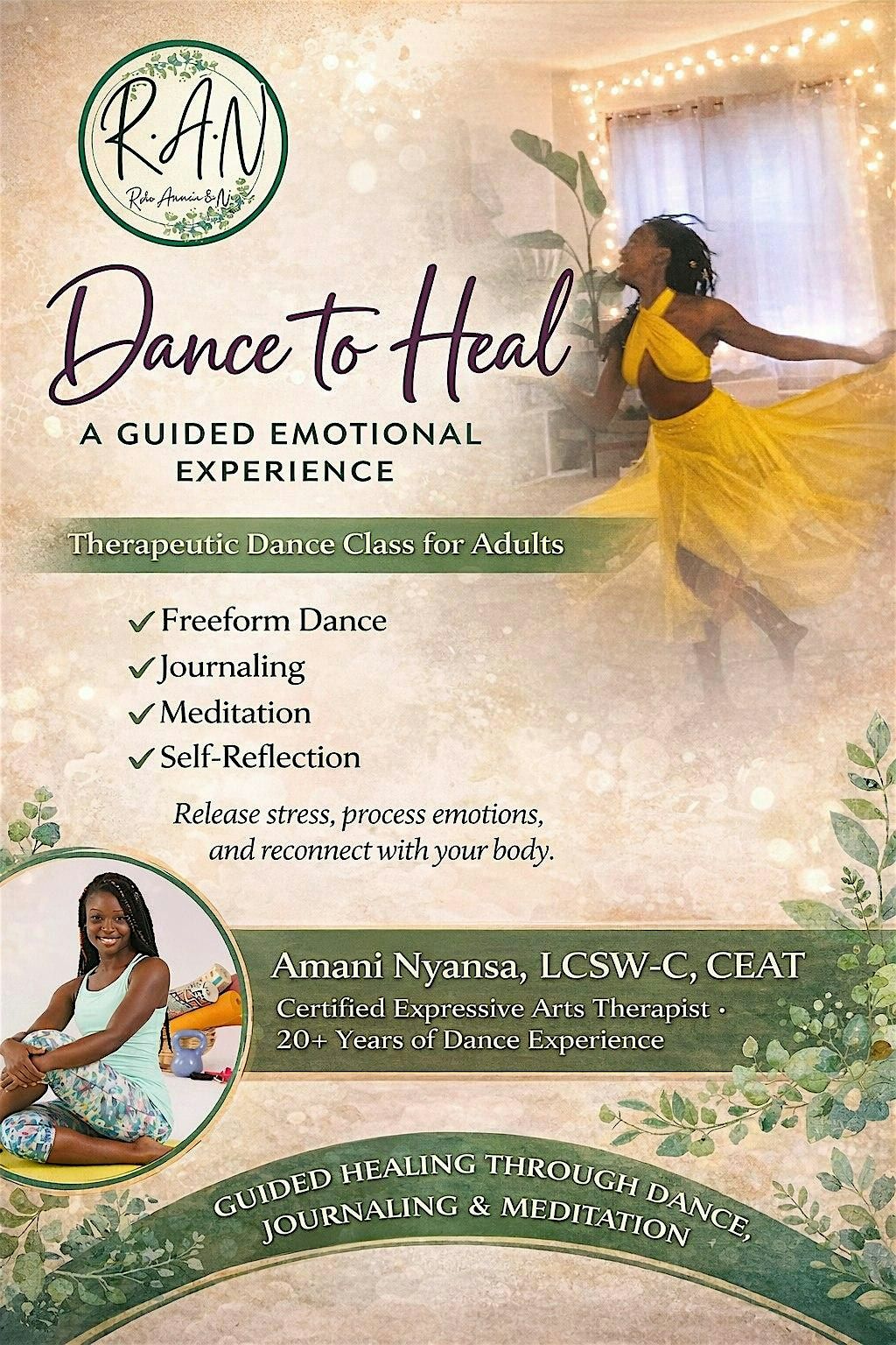 Amani Nyansa is a Licensed Clinical Social Worker (LCSW-C) and Certified Expressive Arts Therapist with over 20 years of dance experience.