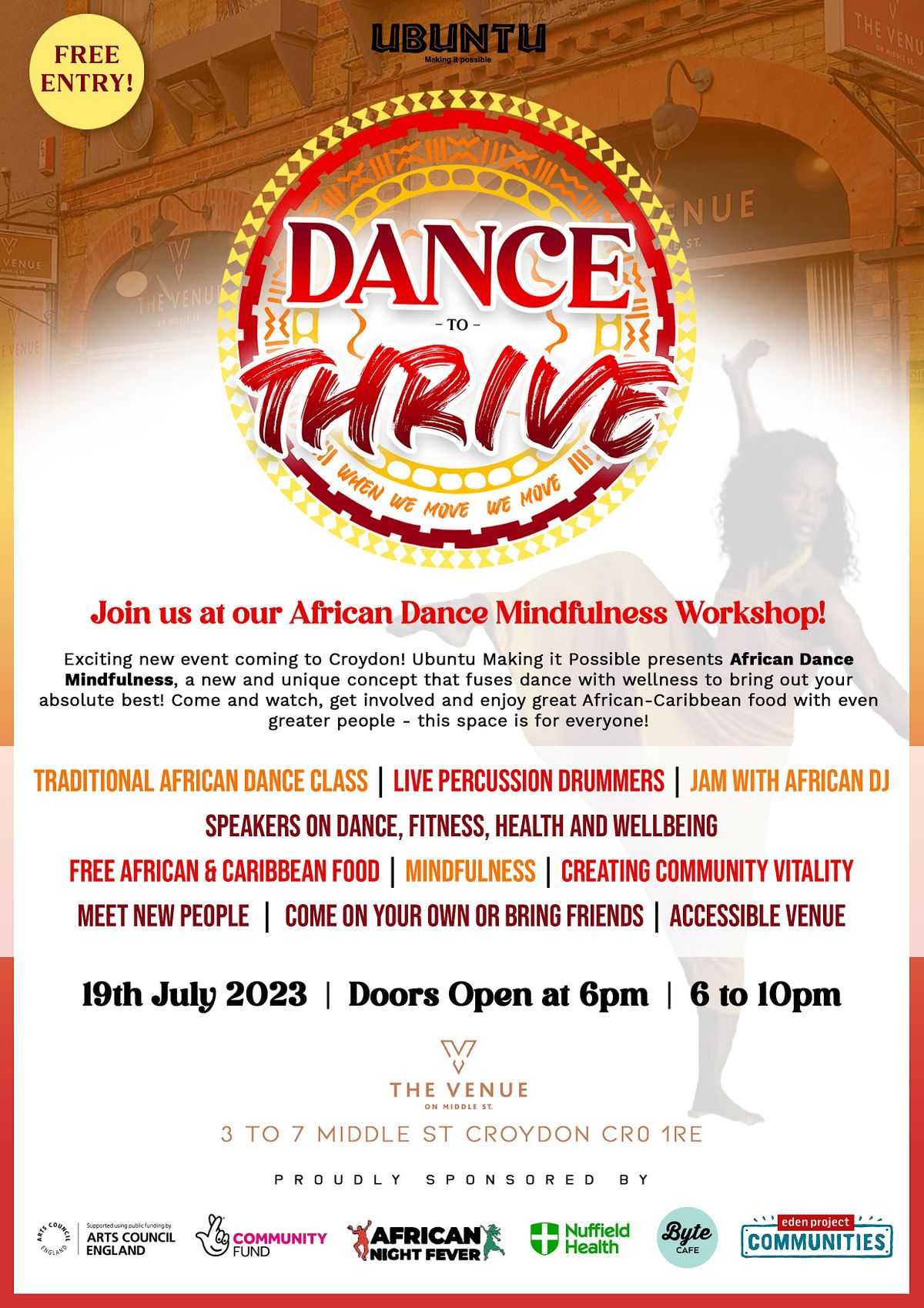 Come and watch, get involved and enjoy great African-Caribbean food with even greater people. Dance To Thrive is for everyone from all ages, genders and backgrounds. This African Dance Mindfulness workshop builds into your life. It's about the journey of transformational change. lifestyle transformation, health, fitness, mindfulness and wellness.