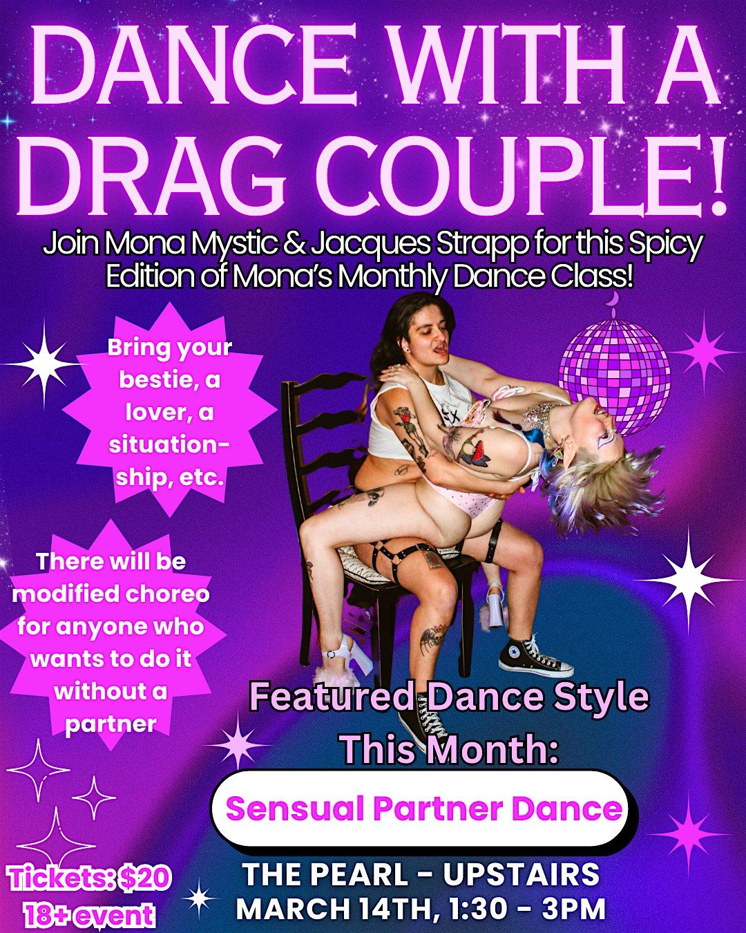 For this class Mona is being joined by their partner Jacques to teach a dance class for duos. We will be rolling around on the floor and being super sexy so please bring knee pads and wear whatever shoes and clothes you feel comfortable in! Come dance with a drag queen and king!!!
