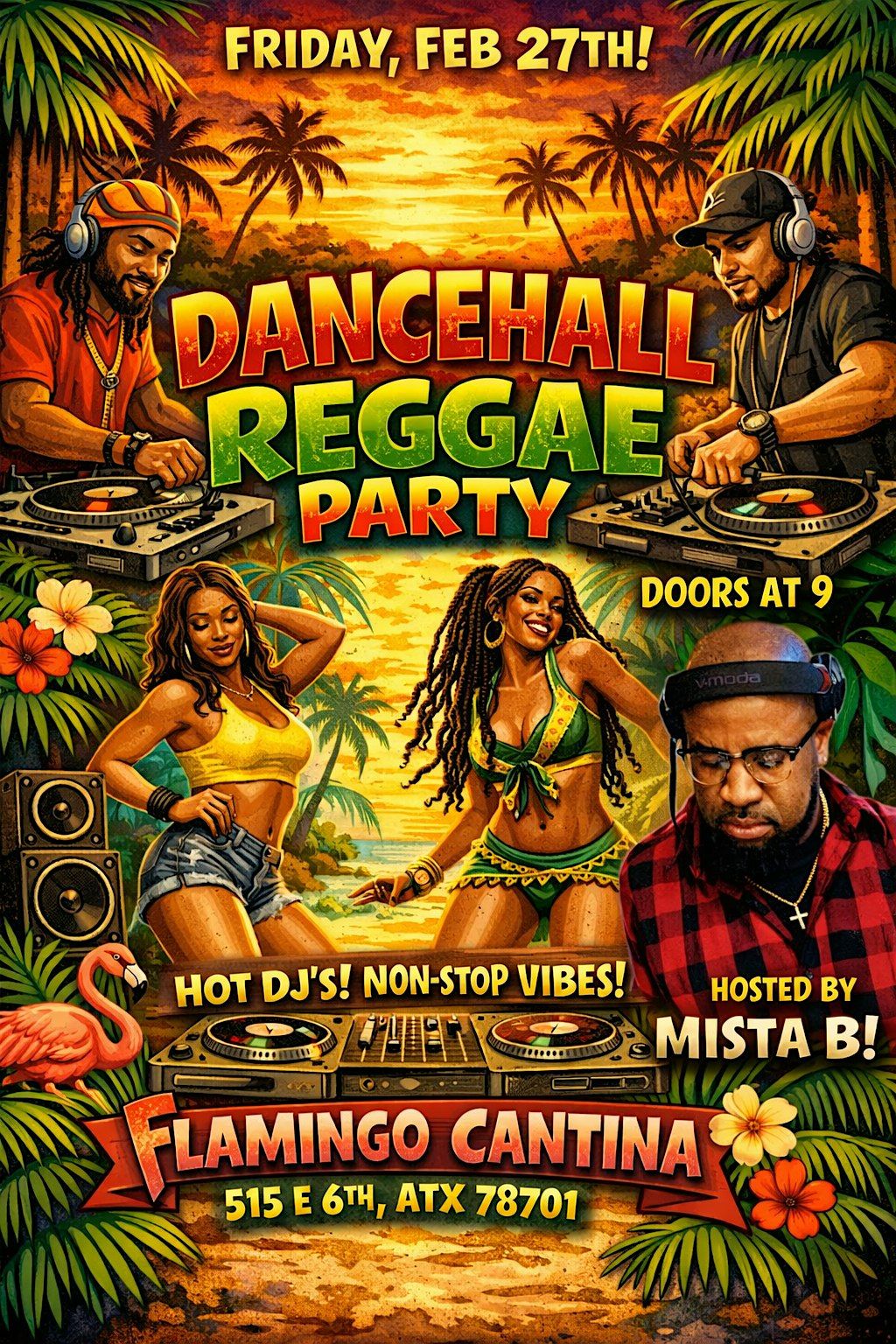 Get ready to get your groove on at Flamingo Cantina on Saturday, February 27th! 🎶 Dust off your dancing shoes and join us for a night filled with fun party music including your favorite Dancehall & Reggae bangers all night. Musical Niceness by Mista B + more! Don't miss out on this dance party that will have you grooving with the vibes. See you there!