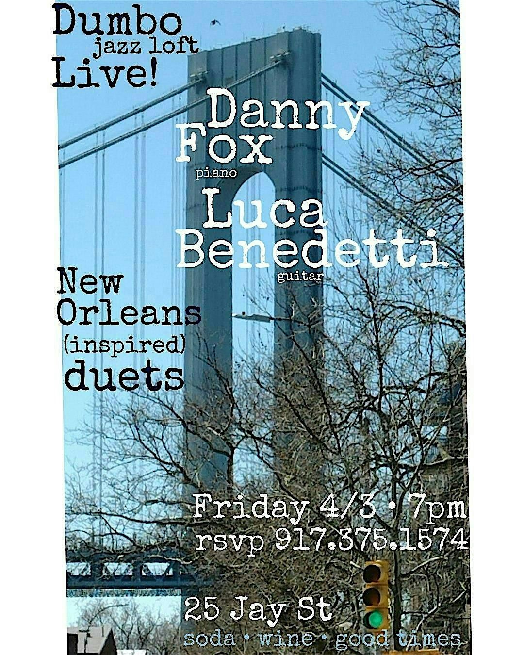 Next up, Dumbo Jazz Loft! A stripped-down and special New Orleans tribute led by greats Danny Fox and Luca Benedetti on acoustic piano and guitar. Two sets and great times; we're limiting ticket sales on this one to keep it smaller and more initmate. And in the spirit(s) of the Big Easy, we're going with a FULL open bar complimentary with the ticket. (Ages 21+ on this one.) Doors at 7pm, with music to start shortly after. Don't miss this one for a little different spin on the usual loft gigs, it's gonna be a blast!