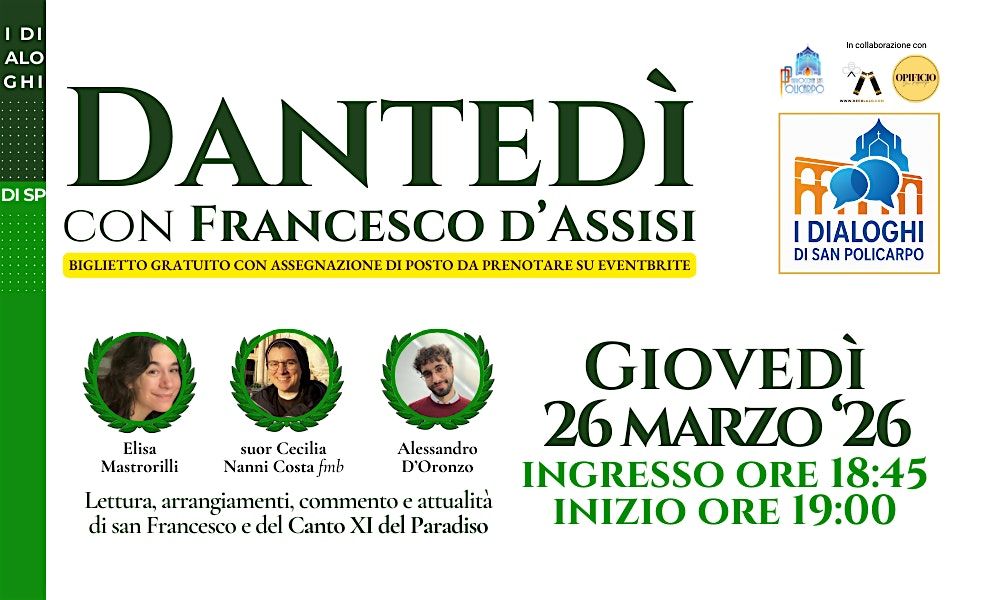 Unisciti a noi il 26 marzo 2026 alle 18:50 (CET) presso la Chiesa Parrocchiale di San Policarpo per celebrare insieme il Dantedì 2026 con un omaggio speciale a Francesco d'Assisi. Sarà un momento unico per immergersi nella cultura e nella spiritualità, in compagnia di amici e appassionati. Non mancare a questa serata speciale!