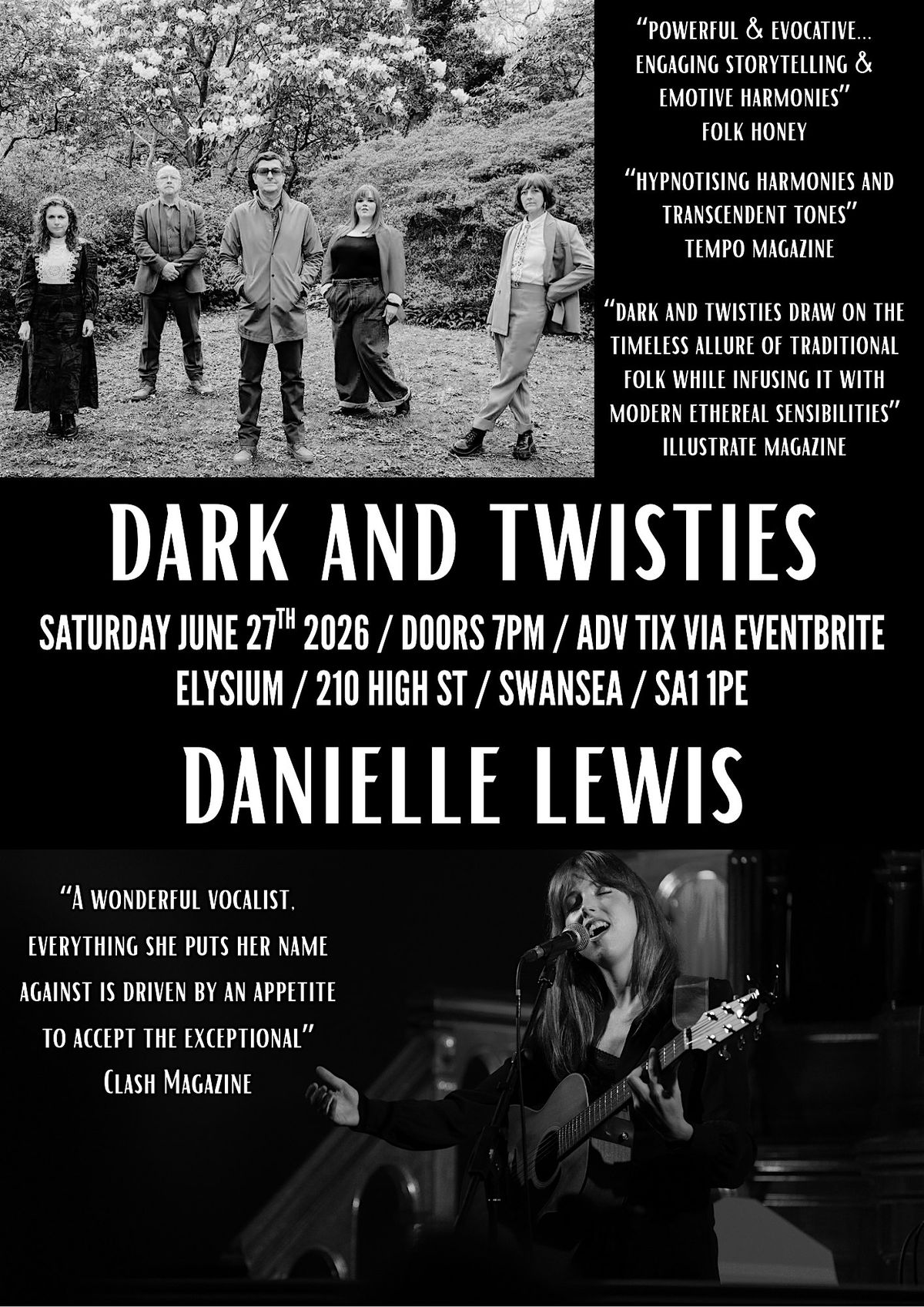 Dark and Twisties are a folk outfit hailing from Swansea. They consist of Sarah Birch (vox, percussion), Kate Ronconi (words, vox, strings, banjo), Sarah Passmore (vox, acoustic guitar, banjo), Danny Kilbride (bass guitar, acoustic guitar, mandolin, vox) and Huw Rees (drums and percussion).