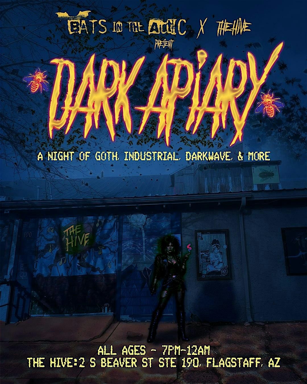 Join us for DARK APIARY, the ultimate Goth Night hosted by Bats In The Attic at The Hive! Dive into an eerie atmosphere filled with dark beats, moody vibes, and a community that loves all things gothic. Whether you’re a night owl or just here for the scene, expect a wicked good time and cool company. This is an in-person event you won’t want to miss!