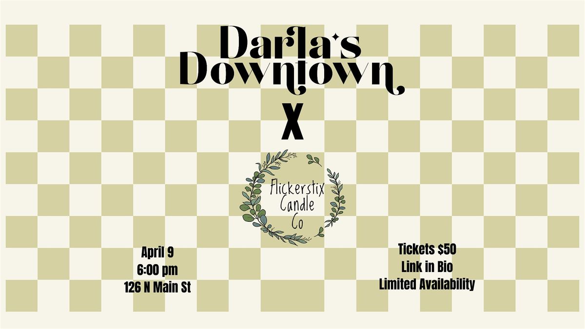 Join us for a Darla's & Flickerstix Collab candle pouring evening! Tickets are $50 and space is limited, so get yours now! Your ticket includes your candle, light bites, & drinks!