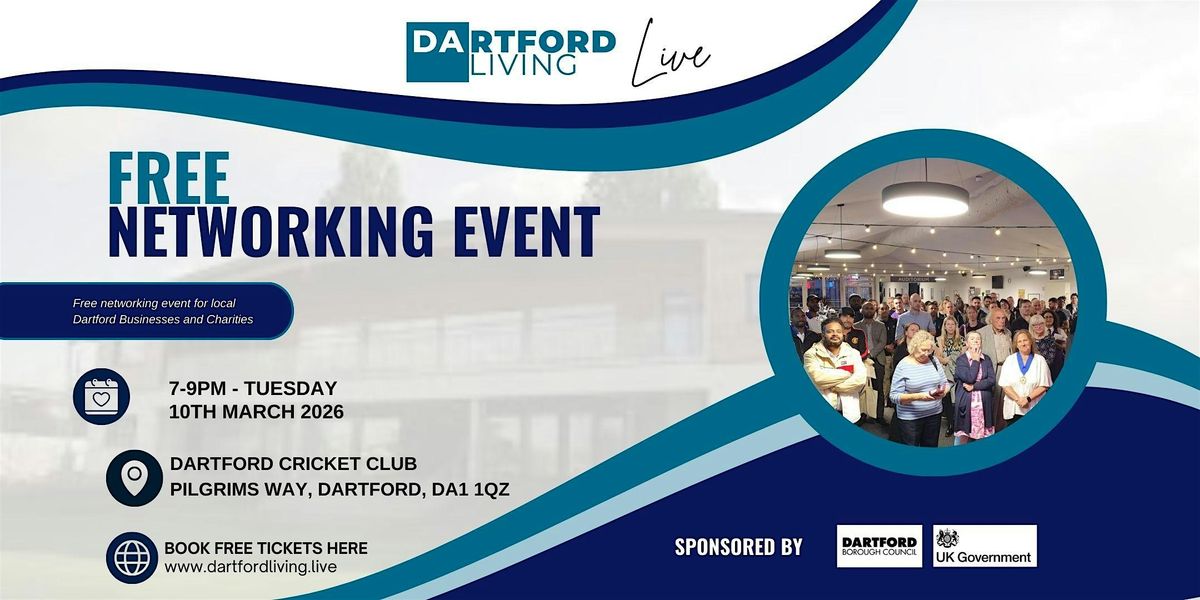Dartford Living are pleased to announce that the next Dartford Living Live, a networking event for Dartford businesses and charities, is being held at Dartford Cricket Club on the 10th March 2026 from 7pm to 9pm.