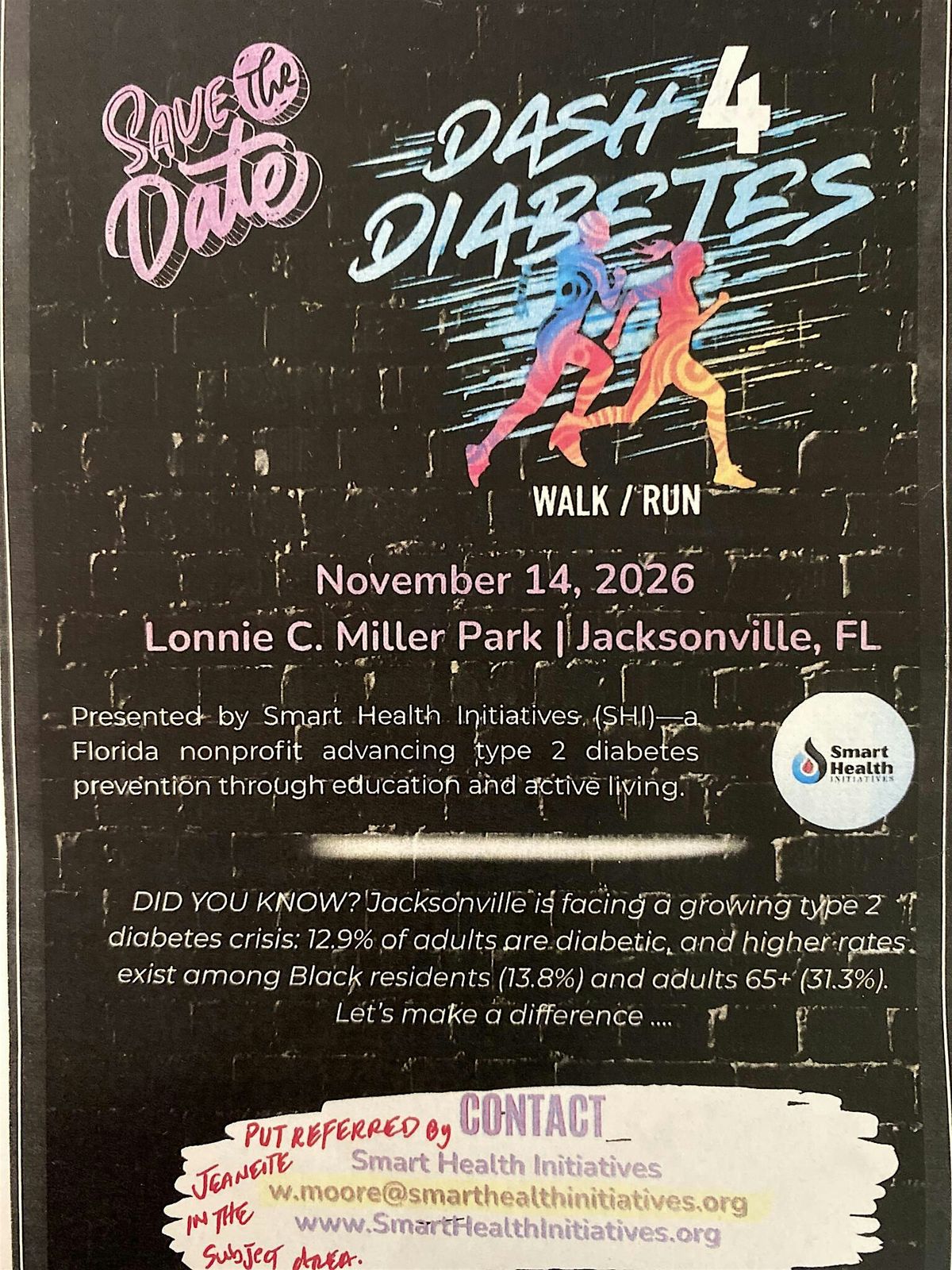 This Year Will Be The 1st Year Jacksonville, FL Will Be Hosting the 8th Annual “Dash 4 Diabetes “ Walk/Run. It Will Be Held @ Lonnie MillerAbout this Event