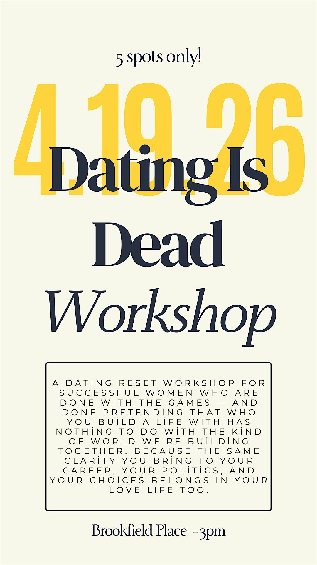 The Dating Is Dead workshop is a 3-hour intensive for successful progressive women who are tired of being razor-sharp everywhere except their love life. In one focused session, you'll uncover the patterns that keep undermining you, build a values-based profile of the partner you actually want — someone who matches your ambition, your politics, and your vision for your life — and walk away with a concrete strategy for finding them, backed by a community of women who are done shrinking too. No recycled advice. No compromises. Just the reset you've been putting off.