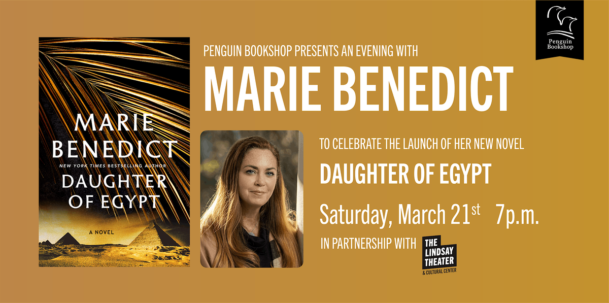 The Penguin Bookshop is pleased to welcome back local author Marie Benedict to celebrate the launch of her latest book! In Daughter of Egypt, Benedict transports readers from the glamour and turbulence of 1920s Britain and Cairo to the sands and lush shores of ancient Egypt as she weaves a story of a young woman who unearths the truth about a forgotten Pharaoh, rewriting both of their legacies forever. Marie will engage in a conversation about the book and her research process. The discussion should last approximately one hour, and will conclude with a Q&A from the audience.