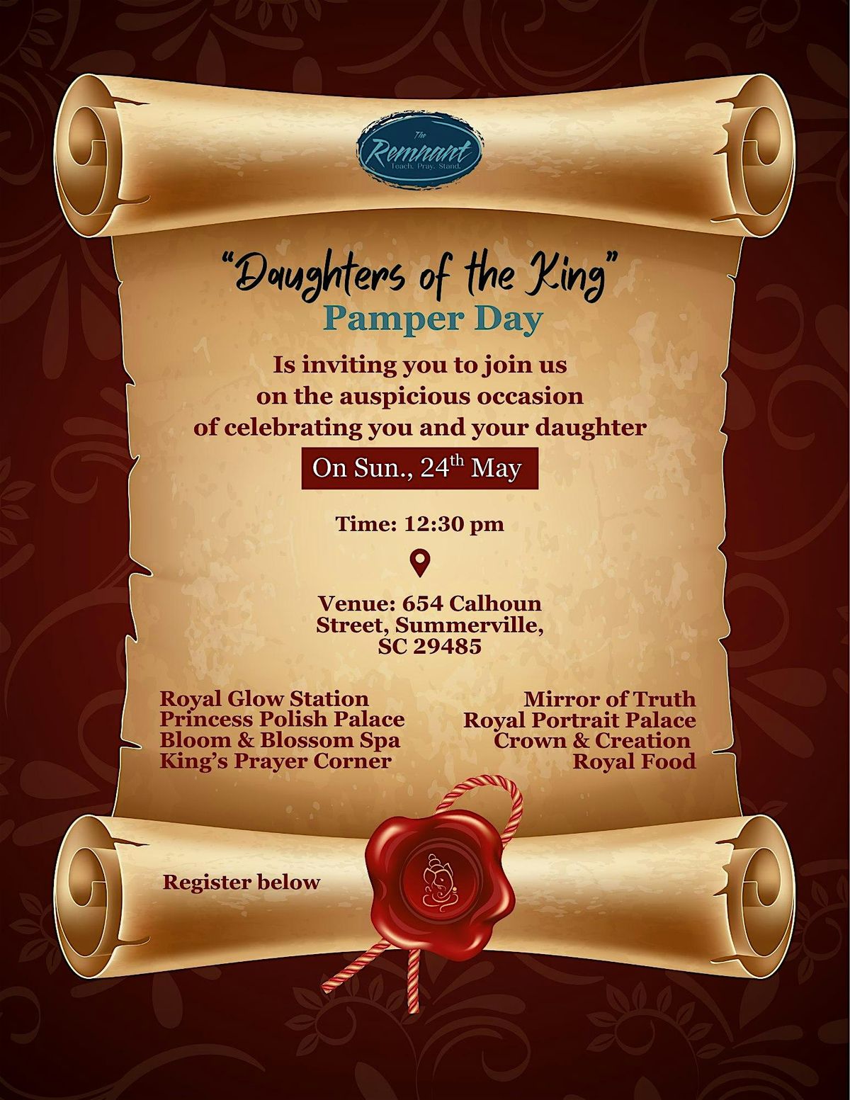 Hey there! Join us for the Daughters of the King Pamper Day, a fun and relaxing in-person event designed just for you. Take a break, unwind, and treat yourself to some well-deserved self-care. It’s the perfect chance to connect, laugh, and leave feeling refreshed and fabulous. Don’t miss out on this awesome day made especially for our amazing daughters of the King!