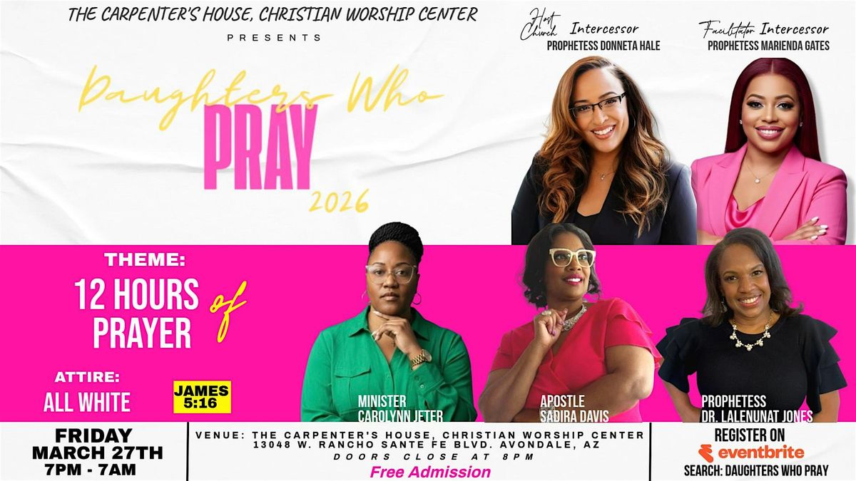 The purpose of this prayer gathering is to unite women from across the region for a night of corporate intercession, worship, and spiritual renewal. This 12-hour event will provide a sacred space for women to gather, pray for families, communities, and nations, and seek God's presence with one voice.