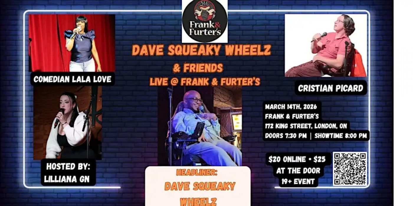 Dave Squeaky Wheelz is rollin into town bringing the laughs & his funniest friends to Frank & Furters in London, On! 19+ Event