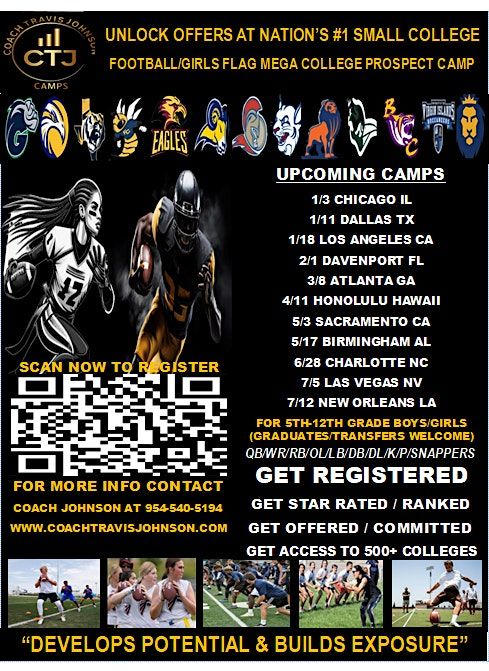 FL BOYS FOOTBALL / GIRLS FLAG WINTER MEGA COLLEGE PROSPECT CAMP NOW AVAILABLE FEB 1ST AS ONE OF THE FIRST COLLEGE PROSPECT EXPOSURE CAMPS OF SEASON AND OFFERS IN-PERSON COLLEGE SCHOLARSHIP OFFER EVALUATIONS WITH SEVERAL COLLEGES