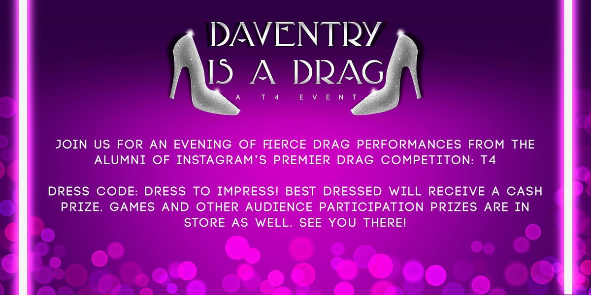 DAVENTRY IS A DRAG is the start of a hopeful regular series of drag events coming to a town in great need of social events and a community feel. Daventry resident Alexa Terrestrial has brought together some of Europe's best up-and-coming artists that have all appeared on Instagaram's premier drag competition: "T4" - hosted by Alexa. You will be welcomed into Daventry Working Men's Club with a DJ playing your favourite throwback and current hits, before you get to be mesmerised by the drag on offer, with some opportunities for the crowd to get involved in the fun!