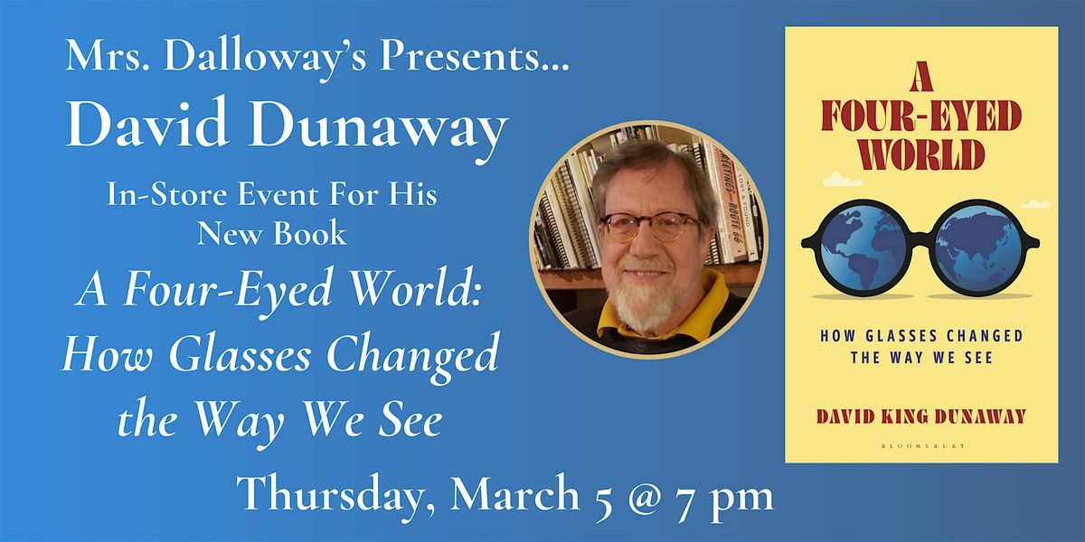 Join us at Mrs. Dalloway's Bookstore on Thursday, March 5 when David Dunaway comes to the store to present his new book A Four-Eyed World: How Glasses Changed the Way We See. David will sign books after the discussion.